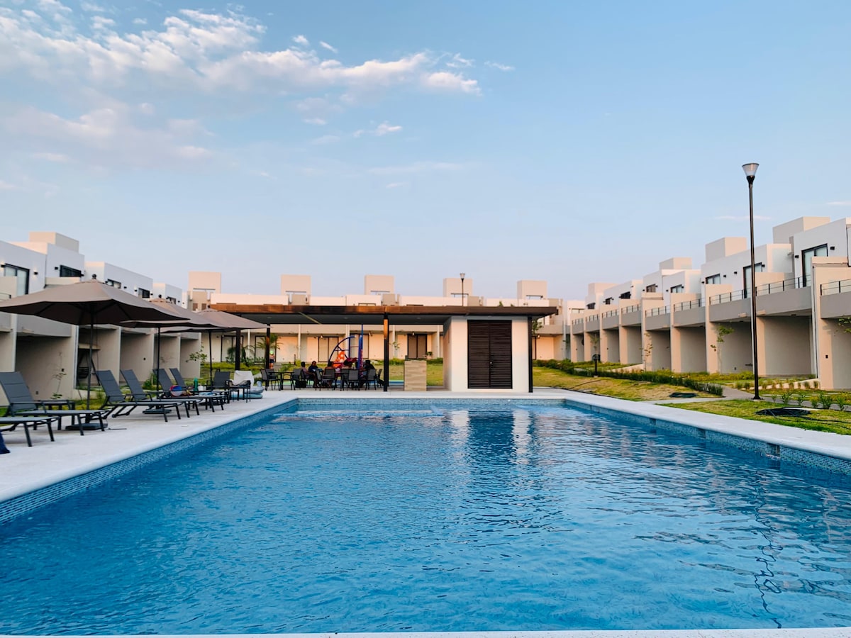 Casa PET FRIENDLY cómoda y climatizada. Exclusivo Residencial, para vacacionar o hacer Home Office cómodamente . Con jardín interior, set mesa de Picnic y bancas, fogata de gas, asador Weber de gas. Y alberca climatizada dentro del Clúster. Gimnasio en Casa Club, Lago artificial, albercas públicas y canchas de Pádel. Wifi, NETFLIX, Prime, Vix, y Tv por cable, HBO, XBOX, Disney +, Star +, Smart Access y como “PLUS” Smart Devices(Opcional su uso ). Seguridad las 24 hrs. A 10min. De Six Flags.