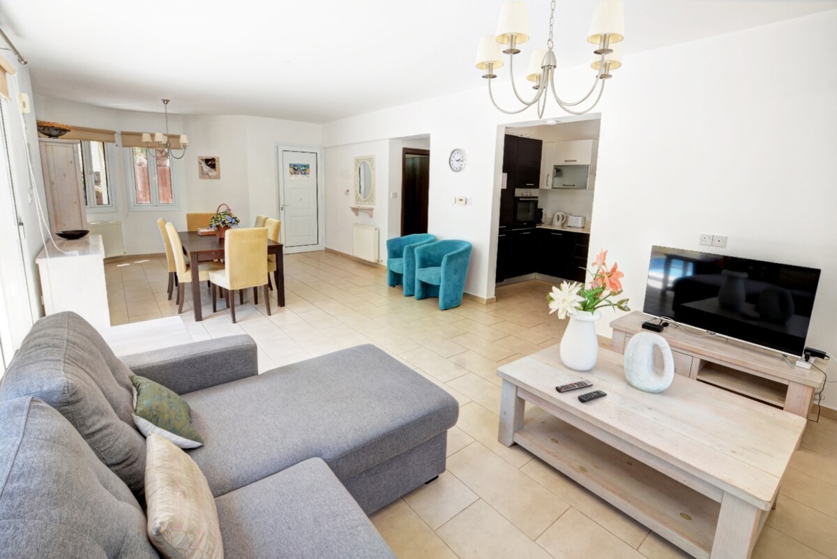 ☆☆☆ Your vacation home and/or office in sunshine☆☆ Tranquil 2 bedroom apartment, Kyklades BC6, free wifi, dishwasher in Kapparis is located JUST 700M FROM THE BEACH, in a very friendly and secure complex with 2 LARGE POOLS and more amenities. Our home will be your safe home for your vacations or your office in sunshine!!! We give so much attention to cleanness and safety! The location will be also a great surprise as it is so near to everything but at the same time in a very quite neighborhood.