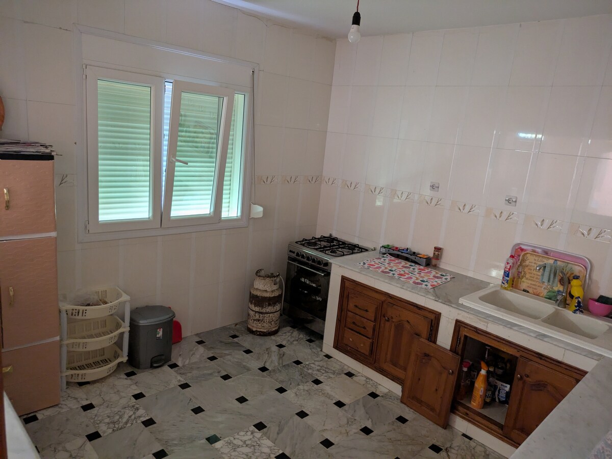 Prostorný 4pokojový apartmán, dobře vybavený, ve 3. a posledním patře, 2 terasy s úchvatným výhledem, klimatizace (2 jednotky chladící celý dům), parkování pro jedno auto v uzavřeném nádvoří u hlavního schodiště, umístěný ve velmi klidné čtvrti, se zcela nezávislým přístupem, 10 minut od centra města, 10 minut od Skikda Corniche.