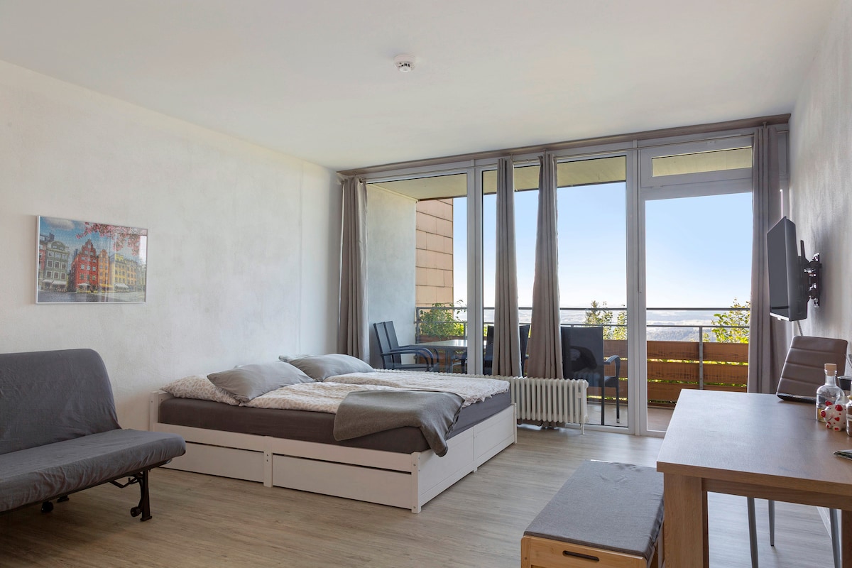 The "Schlössle", a former 4* hotel, is located in the immediate nearby of the town square, centrally located but still very quiet. Byt (cca 75 m ²) je v přízemí. Parkovací místo je hned vedle hlavního vchodu. Obývací pokoj a ložnice mají okna od podlahy ke stropu a balkony směřující na jih. Balkony (20 m ²) vás zvou k opalování, jídlu a vychutnat si fantastický výhled na Rotttal, s výhledem na hory, když je pěkné počasí.