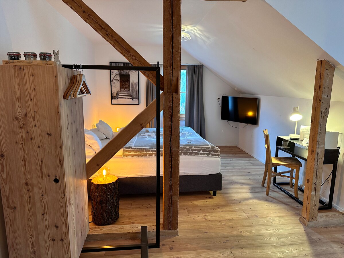 Garsonka, která je druhem přístavby obytné budovy. Architekt miloval kaple, takže z přístavby vznikla místnost vysoká 6 metrů s dřevěným stropem a parketami. Místo na spaní v galerii. S křídly a zahradním prostorem, dokonale zařízené ve stylu - tiché a na okraji lesa. SBahn je asi 30 minut chůze, 2 km daleko. Ideální pro cyklistiku na jihu Mnichova, poblíž jezera Starnberg. Bohužel to není dobrý způsob, jak ubytovat děti. Takříkajíc pouze pro dospělé.