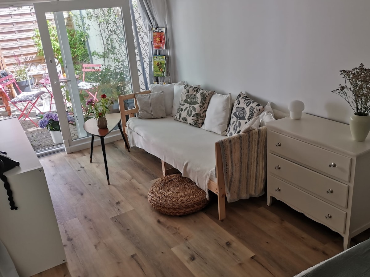 Útulný 30m2 byt v přízemí domu se zahradou +15m2 terasa před domem. 15 minut na letiště v Basileji – 42palcová televize, DVD přehrávač + spousta DVD – kuchyně: mikrovlnná trouba, varné desky, lednice, mrazák, myčka nádobí, Nespresso, rychlovarná konvice... – Možnost snídaně (káva, čaj zdarma, pomerančový džus, krekry, máslo, džem, med, cereální tyčinka a sušené ovoce) – Velký šatník – Postel ustlaná při příjezdu – Ručníky a všechny základní produkty (olej, koření,...) jsou k dispozici – Bezplatné parkovací místo