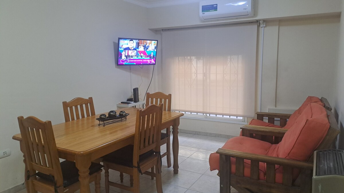 El dpto se encuentra en excelente ubicación, a solo 3 cuadras de Plaza principal y centro comercial. Está muy bien equipado y es confortable. Posee 2 camas, 1 cama de 2 plazas y 1 camas de 1 plaza. Cuenta con ropa de blanco sábanas, frazadas,b almohadas y toallas. Con AA frío calor y ventilador de piso( turbo) Es muy luminoso y con buena ventilación cruzada. Posee un pequeño balcón. El dpto esta en el 1er piso y el edificio tiene ascensor. y con cochera en el edificio.