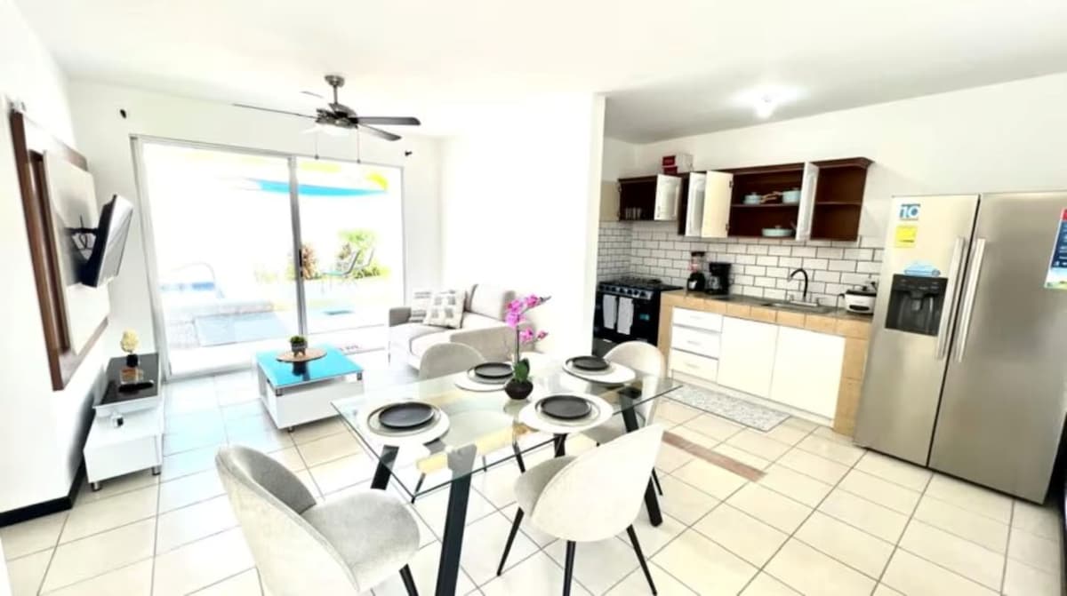 Vítejte v našem moderním domě Jaco Beach House se 3 ložnicemi a 2 koupelnami! Pouze 11 minut chůze od pláže, západu slunce a restaurací v centru města. Odpočiňte si v prostorném domě s plně vybavenou kuchyní, grilem a venkovním jídelním koutem. Nachází se v uzavřené komunitě s nepřetržitou ostrahou, dvěma bazény, hřištěm a salónkem. Prozkoumejte nedaleké národní parky Manuel Antonio nebo navštivte Los Sueños Golf & Marina pro plný zážitek! Spolehlivý internet 150 mbps.