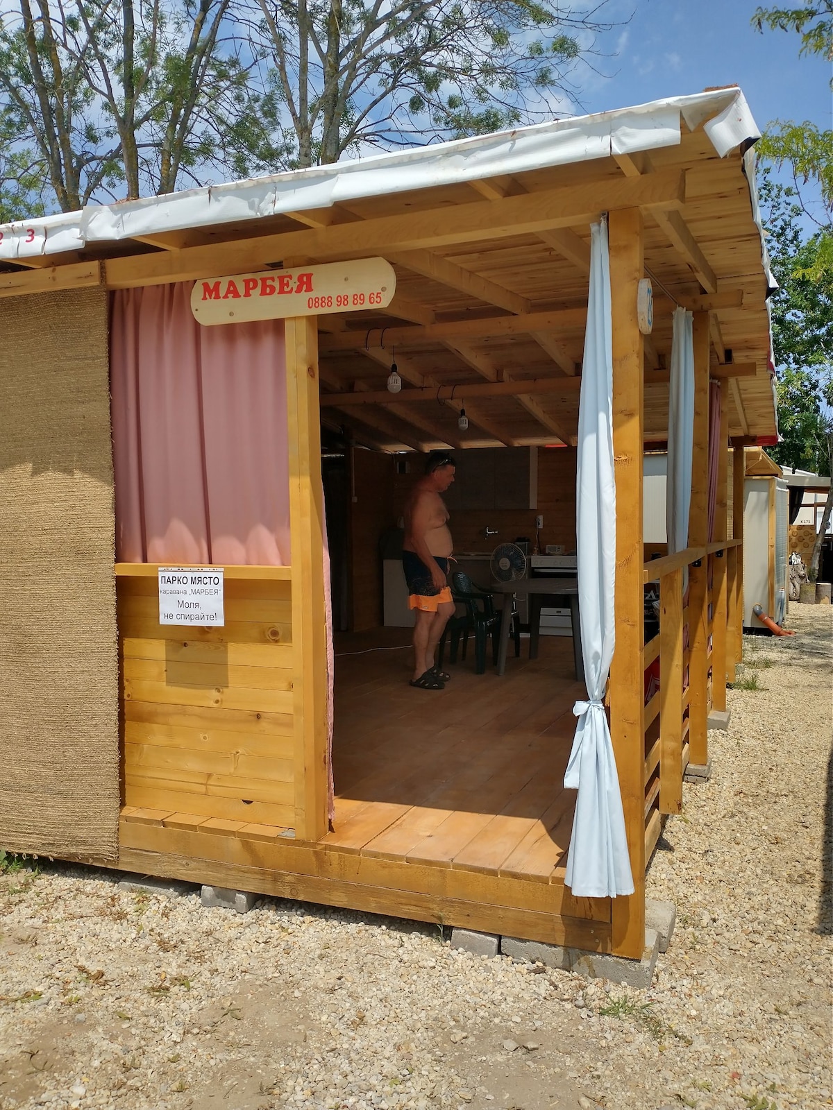 Pod chladným stínem lesních větví na "Offshore" Camping Garden je náš karavan. Nabízí pohodlí ponoření se do moře, aniž byste si nasadili žabky, protože je to 100 metrů od vody. Pokud se rozhodneš využít Aylyaka, kterou nabízí, během dne si můžeš odpočinout na verandě, odpočívat na houpací síti nebo dokonce předstírat, že budeš pracovat z domova. Z roku 2024 má karavan také plně aktualizovanou koupelnu s toaletou. Poznámka! Voda není pitná