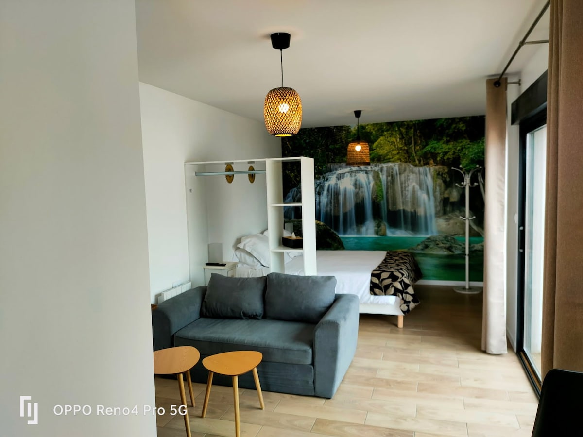 10 km od Bayeux a 20 km od pláží vylodění, v idylickém místě obklopeném lesem a profesionální stájí závodních koní, nabízíme vám samostatné studio plně vybavené kuchyní, ložnicí s koupelnou, TV, wifi a rozkládací pohovkou Můžete si užít relaxační prostor na verandě s vířivkou a posilovnu na rezervaci (1 hodina denně) bez příplatku. Velké parkoviště pro velká vozidla