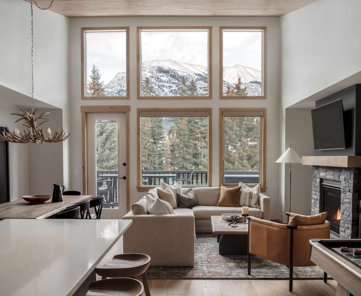 Nový, klimatizovaný a krásně zařízený, špičkový řadový dům v Canmore. Perfektní destinace pro luxusní horské útočiště. Špičkové povrchové úpravy, nerezové spotřebiče, kamenné pracovní desky a otevřený obytný prostor jsou ideální pro velké skupiny. Neuvěřitelný výhled na pohoří Three Sisters a Rundle Mountain z obývacího pokoje/teras. Nebudeš chtít odejít. V pěší vzdálenosti od centra města a potravin (7 minut) a pár kroků od kaváren a restaurací. Parkování zdarma.