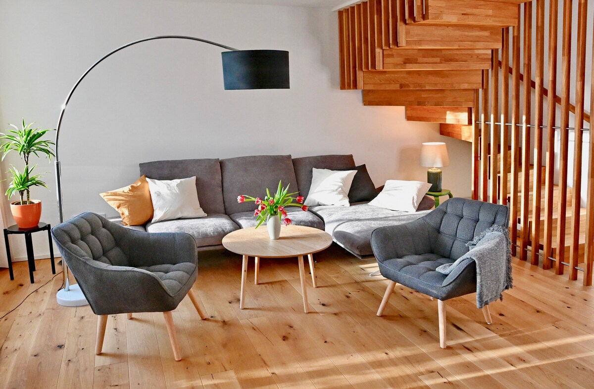 Náš rekreační dům je prostorný, světlý, samostatně stojící architektonický dům s velkou střešní terasou a puristickou zahradou na svahu. Střešní terasa nabízí nádherný panoramatický výhled na Alpy a Zugspitze. Náš dům nabízí plně vybavenou kuchyň s otevřeným prostorem. Pro relaxaci je k dispozici bezplatná infračervená parní kabina a vířivka. Dům je šetrný ke klimatu díky fotovoltaickému systému, bateriovému akumulátoru a vzduchovému tepelnému čerpadlu.