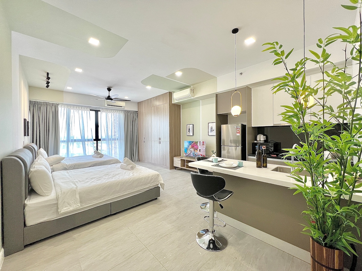 Enjoy a comfy retreat in this suite. Muji feel studio apartment with private bathroom, kitchenette and workplace suitable for couples and family. Renovated with wooden Tatami design, high end finishing and closets.A lovely space to unwind and relax after a busy day whether it is work or play. Less than 20 mins drive to KLIA / KLIA 2 / Mitsui Outlet. Walking distance to variety of eateries and convenience shops such as 711, Starbuck, laundry shop, Thai food and even 24H Clinic and mamak stall!