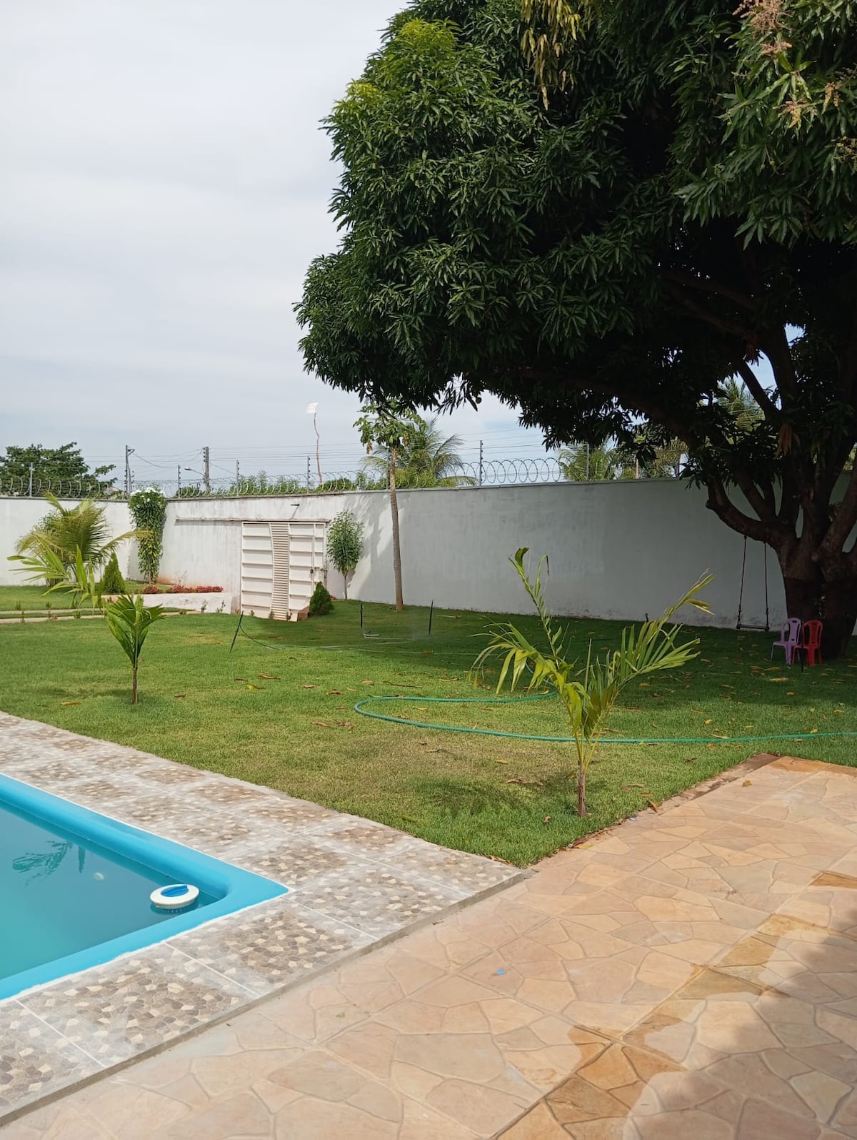 OBS: NÃO LOCAMOS PARA FESTAS/EVENTOS; PROIBIDO USO DE SOM. Espaço 20x40m, com sombras, piscina, deck com churrasqueira, cozinha. Armários, cooktop 5 bocas com botijão de gás instalado, dois garrafões de água mineral, bebedouro, 2 quartos com ar-condicionado, sendo um suíte, banheiro social (os dois com banho quente), alpendre com vários locais para colocar redes, geladeira. Quarto 1 (suíte): 1 cama casal, 1 cama solteiro. 1 rede; Quarto 2: 1 cama casal, 1 cama solteiro, 1 rede,