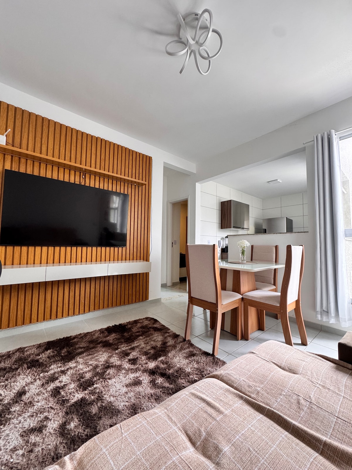 Apartamento completo, ideal para famílias ou grupos! Sala com sacada e cozinha equipada com ar condicionado, 2 suítes com ar-condicionado e 2 vagas de garagem. Condomínio com piscina, parquinho e sala de jogos. Ao lado de supermercado com restaurante, feira, Lojas Americanas e parada de ônibus. Próximo à charmosa Praça Brasil. Áreas comuns exclusivas para hóspedes.