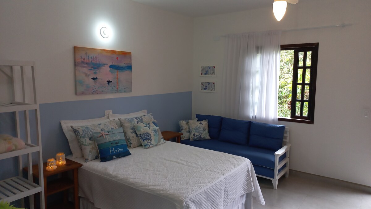Odpočiňte si v tomto klidném a stylovém prostoru, kde je vše uspořádané a promyšlené tak, abyste si mohli užít volný čas a odpočinek v blízkosti pláže v Barra do Saí. Studio je jedinečný prostor, který integruje ložnici, obývací pokoj a kuchyň. Kromě toho máte přes velkou francouzskou okenní dveře přístup na prostorný balkon s grilem, stolem, židlemi a houpací sítí. Část tohoto prostoru je krytá, což umožňuje jeho využití i v deštivých dnech; část je otevřená, takže si můžete užít slunce.