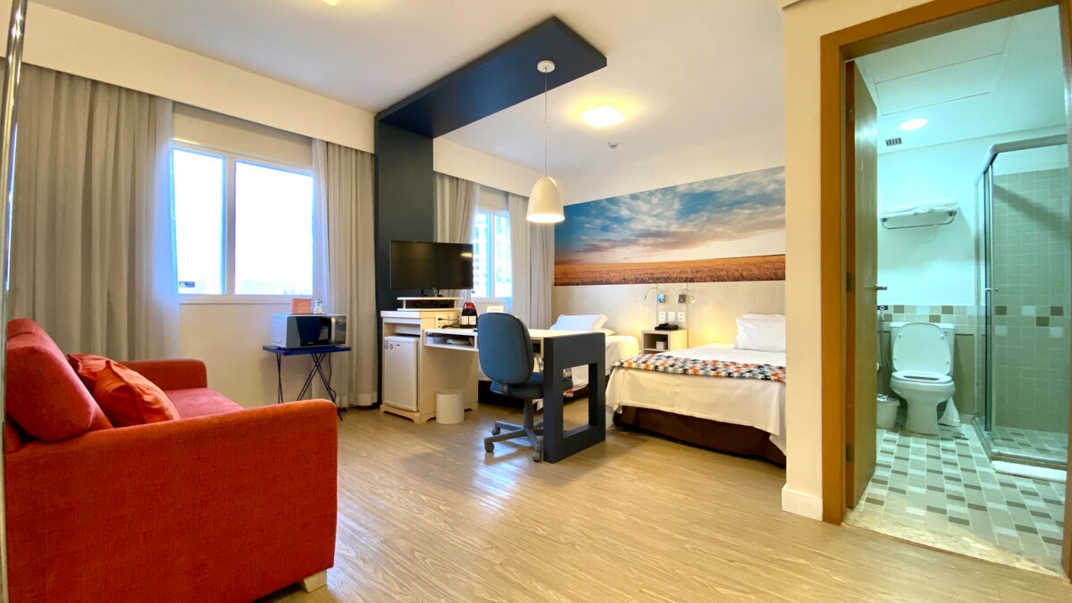Pohodlný apartmán s jednou ložnicí v nejlepší lokalitě Alphaville. Krátká procházka do supermarketů, restaurací a nákupního centra. DENNÍ ÚKLIDOVÁ služba v ceně! Prádelna k dispozici . Nedaleko: DuPont, HP, Walmart, C&A, Azul, AES, Amil, atd.