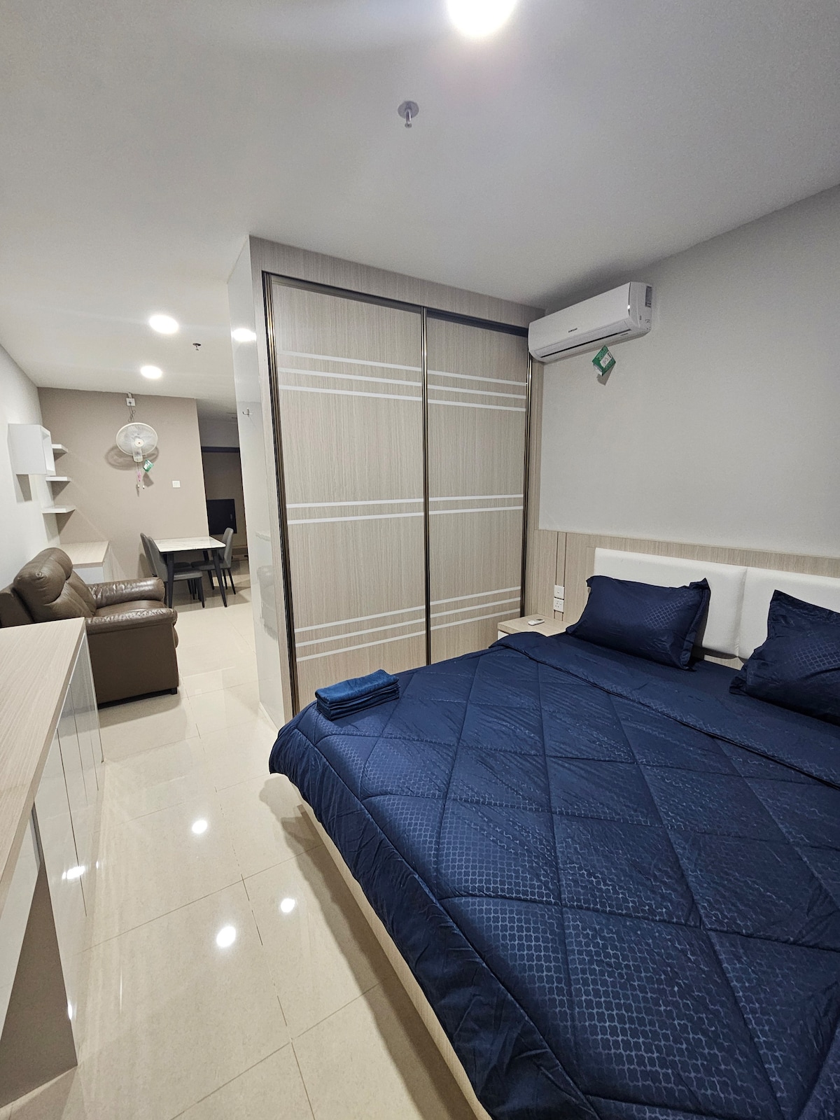 Meisterstadt Pollux Habibie Apartmán s nákupním centrem dole. V docházkové vzdálenosti od obchodu a restaurace. WiFi během pobytu. 50palcová Android TV pro zábavu v noci. V hlavní ložnici máme manželskou postel a 3 v 1 samostatnou rozkládací postel, takže ubytování pro 4 osoby není problém. V obývacím pokoji je rozkládací pohovka, takže pokud máte 5. hosta, rádi ho ubytujeme.