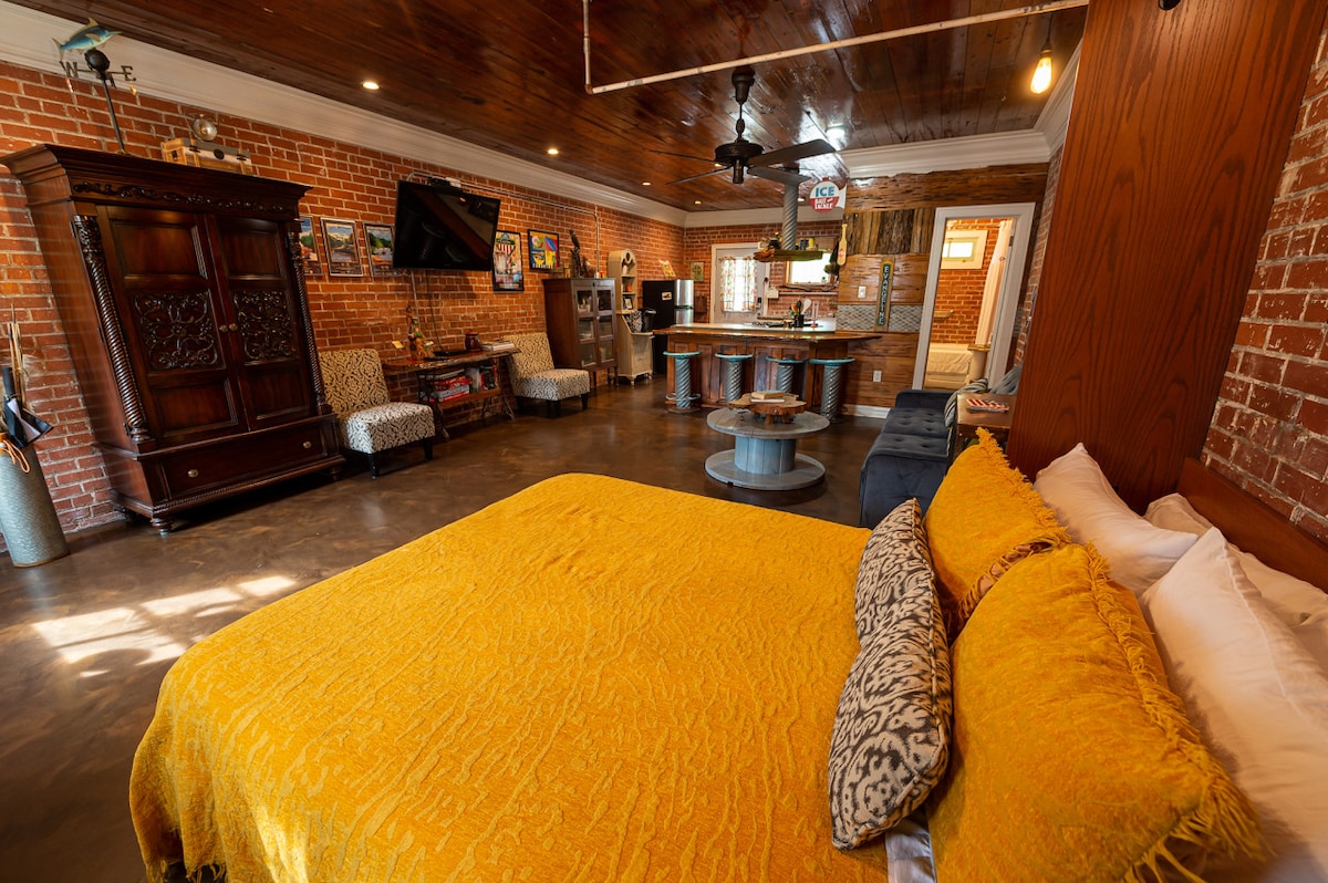Vítej v Bayou Chateau, tvém útočišti v centru města Bayou Front. Odhalené cihlové zdi a teplý strop s dřevěnými panely vytvářejí jedinečně útulnou a lákavou atmosféru, která je ideální pro volnočasové i služební cestující. Otevřený prostor nabízí sklápěcí postel velikosti queen a pohodlnou rozkládací pohovku pro dvě osoby. Plně vybavená kuchyň, relaxace ve vířivce. Vrcholem tvého pobytu bude velká zadní terasa, která nabízí úžasný výhled na klidné okolí zátoky.