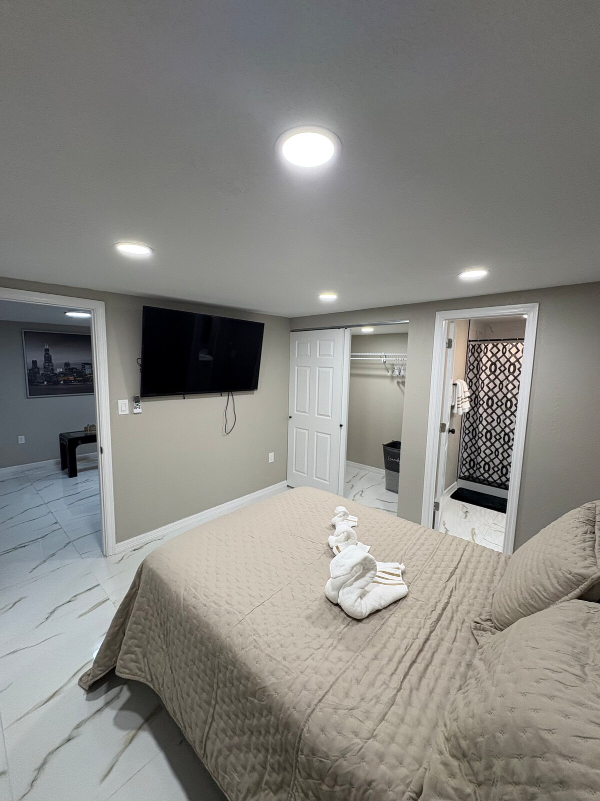 Manželská postel s koupelnou + menší manželská postel 2/2/1—2 obytné prostory + 4 televize