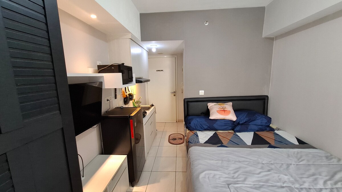 Stay comfort in a warm studio room with nice city view and the lagoon beside. Completed with kitchen set, queen bed size and working space with unlimited wifi access, your stay will feel like home. Enjoy various facilities: swimming pool, kids play area, gym, shopping mall, cinema and various restaurants. For health and safety reason to all of the guest, this apartement is cleaned with antiseptic and desinfectant before check-in.