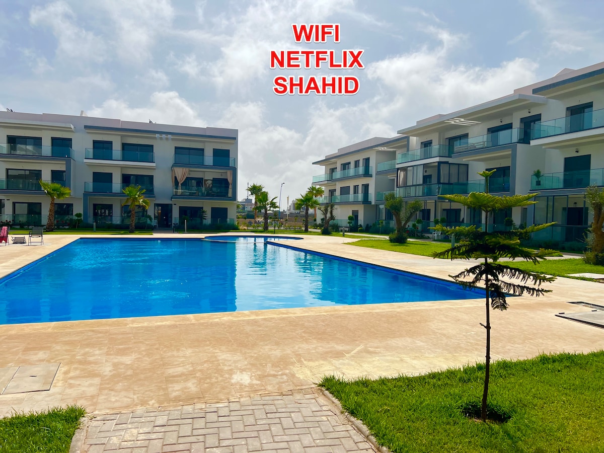 Pouze 30 minut od Casablancy a 5 minut chůze od pláže Tamaris 2, nabízím vám luxusní byt pro nezapomenutelný pobyt. Velký prostor, ničím nerušený a ničím nerušený výhled, toto ubytování nabízí veškeré pohodlí a klid, které potřebuješ: dva bazény, zelené plochy, hřiště pro děti a sportovní hřiště, stejně jako bezpečné parkování v suterénu pro tvé vozidlo. To vše v klidné a bezpečné rezidenci.