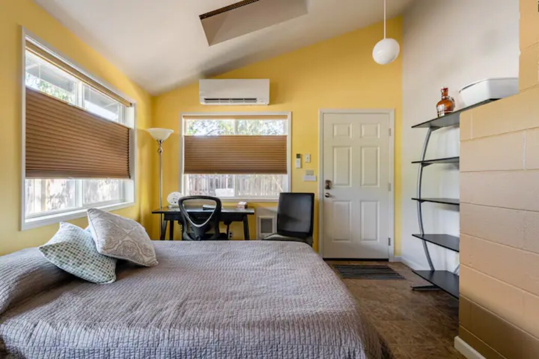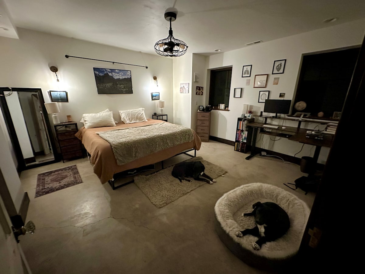 Just over 2 miles from downtown. This is a private room attached to our house with a separate entrance. The room has a double bed, full private bathroom, closet space, a kitchenette, and seasonal access to the outside deck and hammock. Includes heating and cooling controls, a mini-fridge/freezer, microwave, coffee maker, cups, plates, and utensils. Coffee, tea, snacks, ice provided. Great for late night arrivals or early departures! The space is quaint- room & bathroom- 185 sq. ft. total