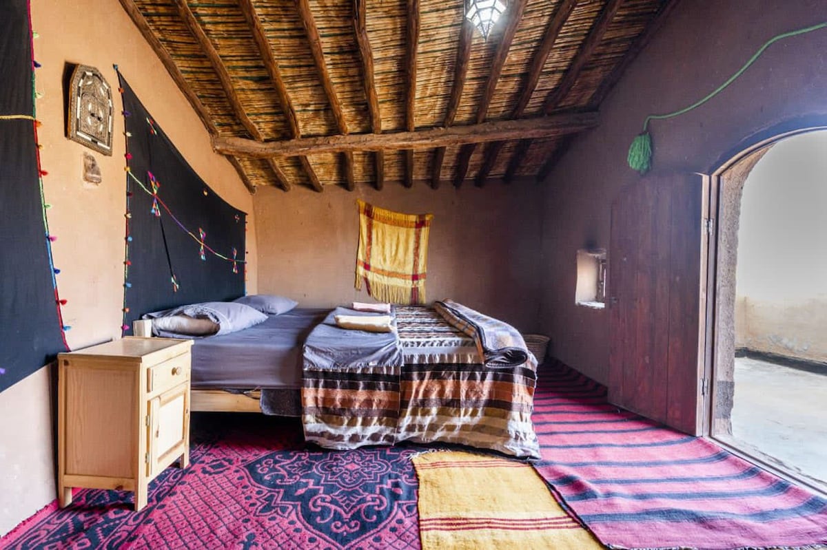 Pokoj na střeše (severní) se nachází na střeše kasby. Zahrnuje: • Jedna manželská postel • Jedno lůžko • Společná koupelna Jednoduchá a pohodlná volba pro hosty, kteří si užívají přístup na střechu a sdílená zařízení při pobytu v historické kasbáze. Pokud si přeješ, abychom ti během pobytu připravovali jídlo, dej nám vědět předem: • Večeře: 12 € na osobu • Snídaně: 5 € na osobu • Večeře a snídaně: 15 € na osobu