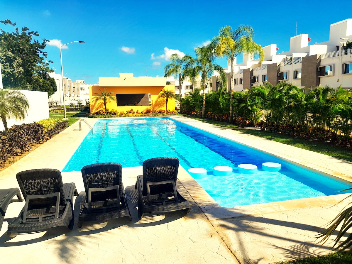 Enjoy a stylish stay in this central and convenient apartment. Just 5 minutes from shopping centers and supermarkets. We are close to the road that leads to Tulum, Playa del Carmen, and the Cenotes Route. The condo has a pool and 24/7 security. Only 15 minutes from the airport and 7 minutes from the Hotel Zone. ** Children under 6 years old are not allowed.