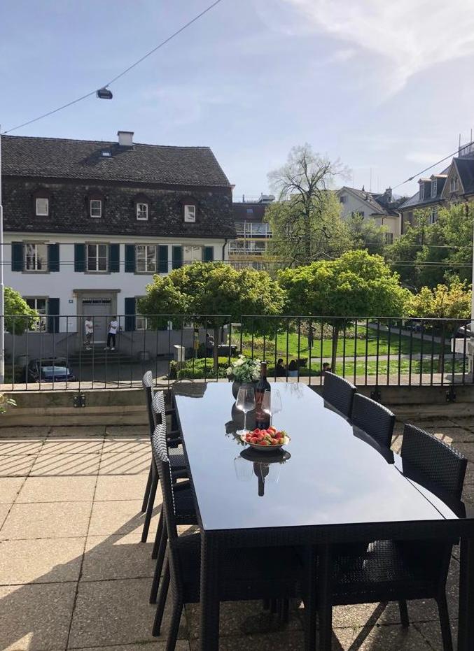 HIGHLIGHTS: 1) We will ABSORB the Airbnb Guest Service Fee of 14% 2) Storage facility available for rent to store bags Highlights: 40 sqm Outdoor Terrace (very rare!) Outdoor dining table & Sun beds Full Privacy Direct connection to Airport (20min) 1 train stop to Zurich HB 10 min walk to Paradeplatz < 1KM to Bahnhofstrasse Situated in a charming & safe neighbourhood, with restaurants, bars, bakery, shops all within proximity. A rare gem in the city center!