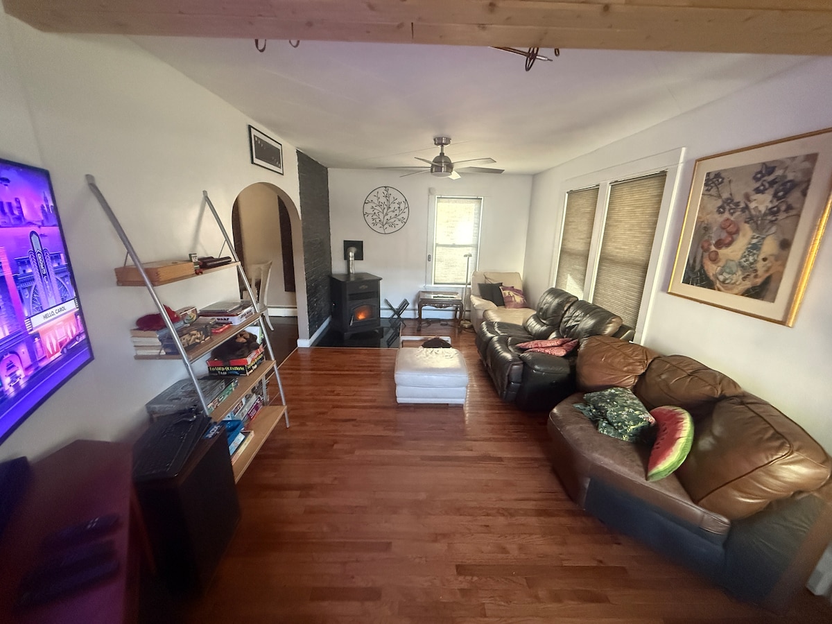 You have full access to this spacious house. Enjoy the large kitchen with a food prep island, ample counter space, basic cookware utensils and ingredients for cooking and baking. The dining room table comfortably seats eight. Relax in the living room with a TV monitor for streaming your preferred services, comfy furniture, and a pellet stove. One bedroom is on the ground floor and two upstairs. Living room is 4 steps down from other ground floor areas. There are no TV monitors in bedrooms.