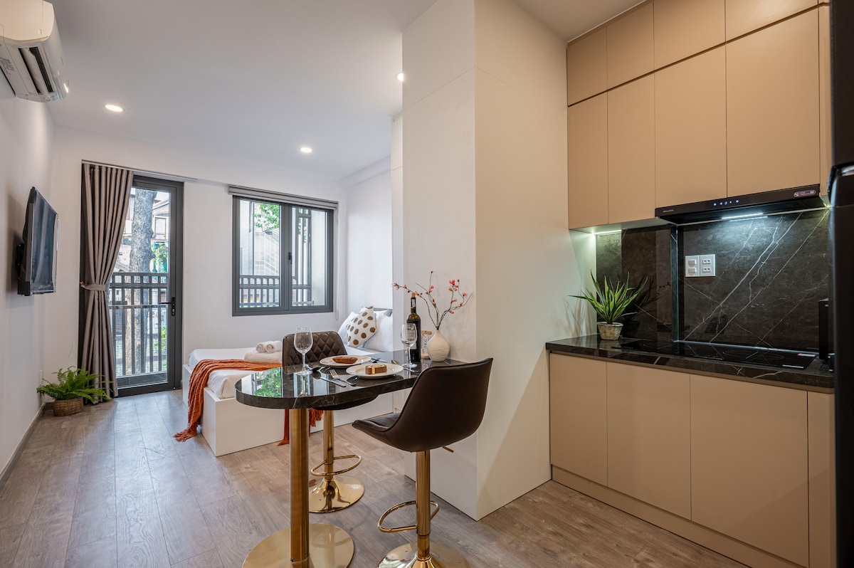Pojďme si užít stylový zážitek v centru města! Je prostorný, čistý a má přirozené světlo. Soukromá kuchyň a koupelna jsou odděleny prostorem na spaní. - 1 měkká postel na dobrý spánek - Balkon s krásným výhledem na město - Výtah, klimatizace, gauč, šatní skříň, jídelní stůl - Lednička, mikrovlnná trouba, vařič rýže, indukční sporák, rychlovarná konvice, kuchyňské náčiní - Chytrá televize připojuje rychlou wifi - BEZPLATNÝ úklid, prádelna+parkování - Přístup nonstop a bezpečně #Adresa: Nguyen Phi Khanh street, District 1