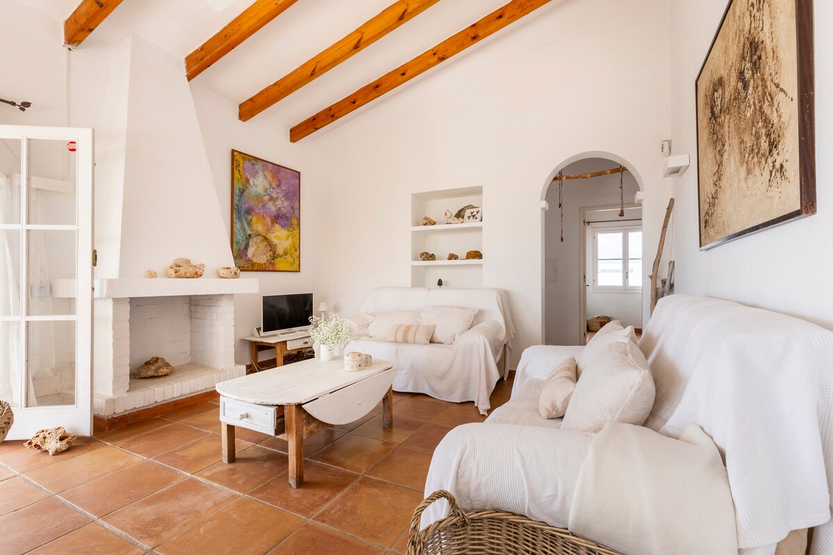 Casa Binimares je krásný dům s výhledem na moře, kde můžeš dýchat klid a pohodu. It is located in the fishing village Biniancolla, in the municipality of Sant Lluis. The beautiful beach of Binibequer is a 5’ It has two double bedrooms and a study with two sofas with a private sink. Kuchyně je kompletně vybavená. Na verandě je gril a stůl s kapacitou pro osm osob. Má úžasný výhled na moře!