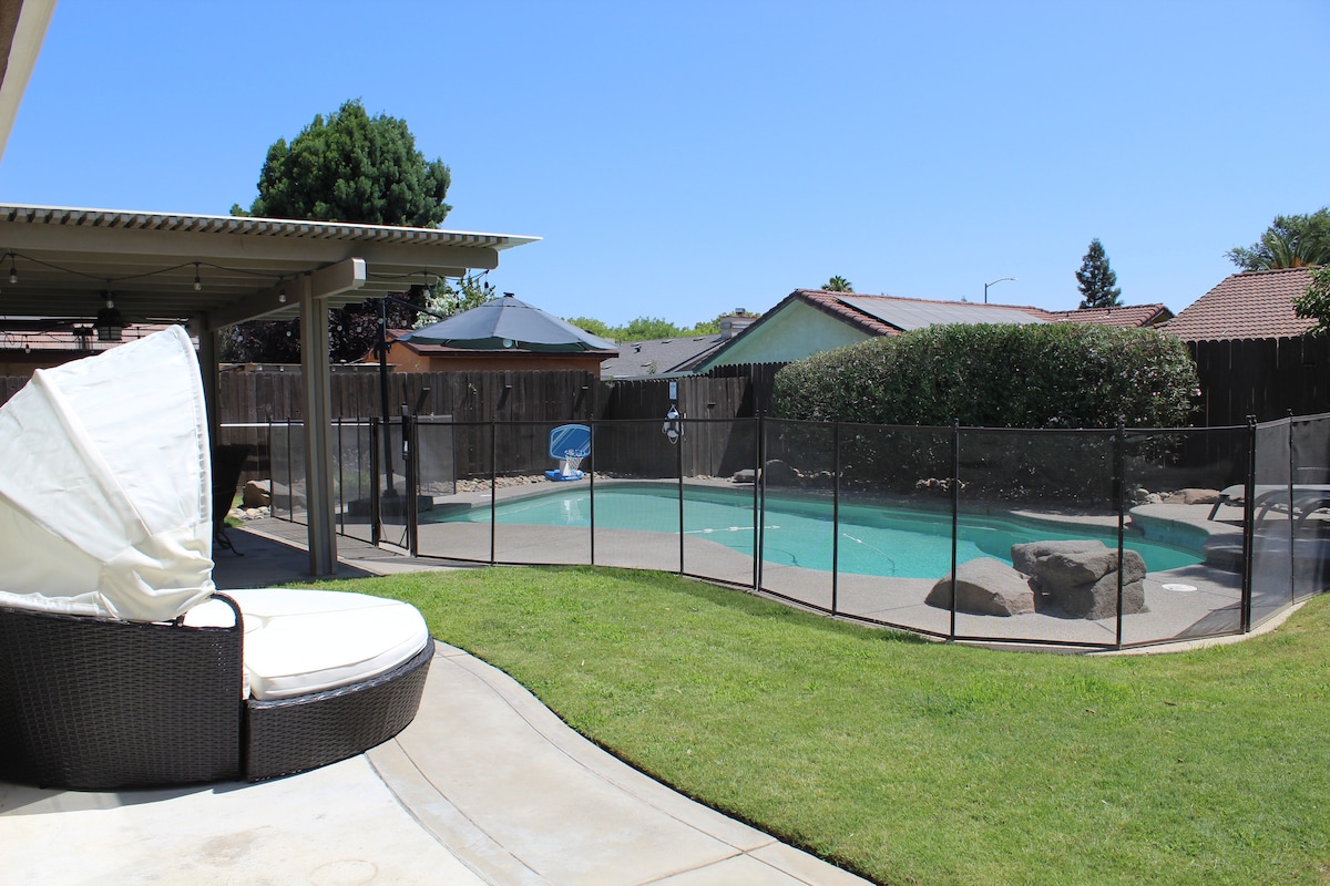 Encompassing three spacious bedrooms, two bathrooms, backyard featuring a swimming pool, brand new hot tub & outdoor dining set the benchmark for NE Fresno grandeur! The entire family-friendly home can comfortably sleep 8 guests. Includes 1 King bed, 1 Queen, 1 Full, queen air mattress & a baby crib. Set over a quarter of an acre, this beautiful home embodies peace & tranquility, ensuring complete privacy. * Please note that parties or gatherings of any kind are strictly prohibited.