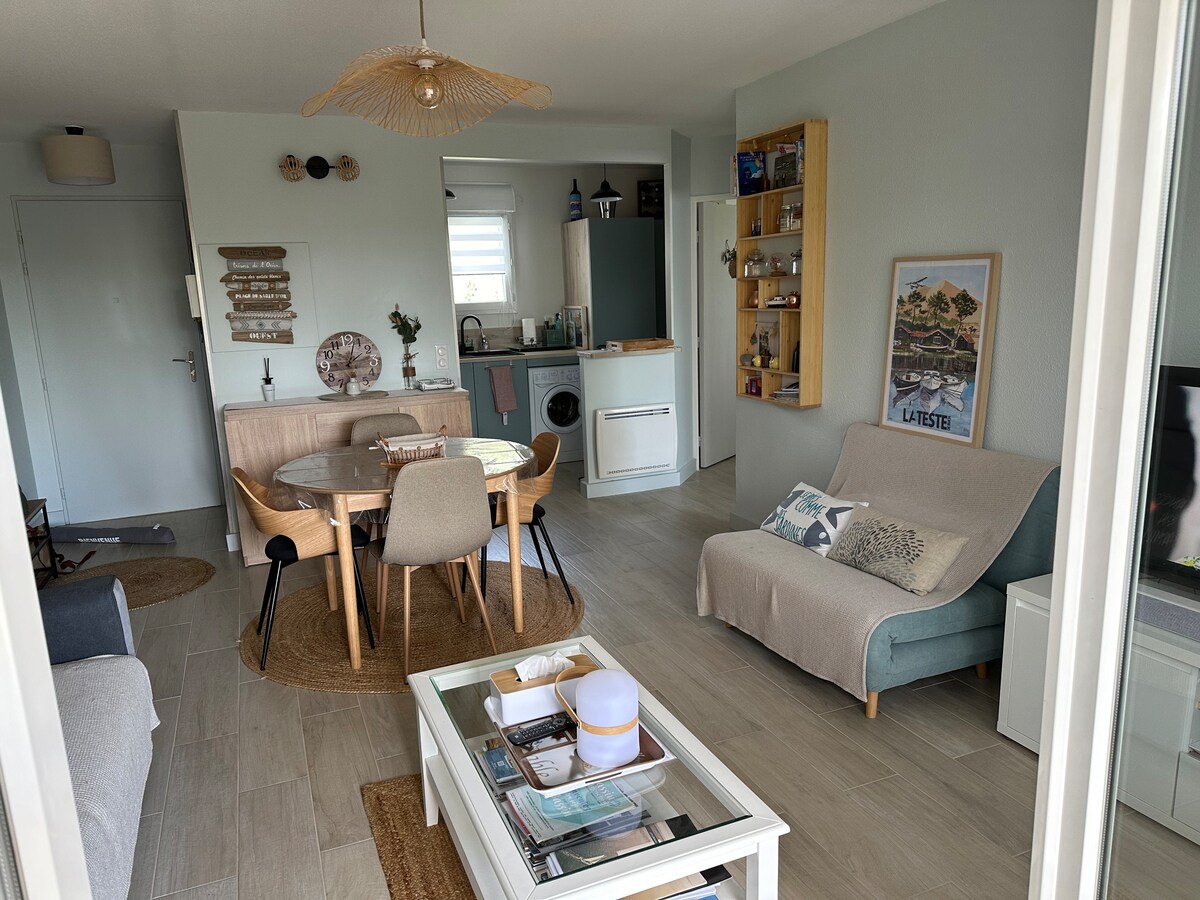 Tento klidný domov nabízí relaxační pobyt pro celou rodinu. - Plně vybavená kuchyň pro přípravu dobrého nádobí. - Obdivuj přírodu a západ slunce z oken od podlahy ke stropu v ložnicích v patře. - Aperitivy pro rodiny nebo přátele na terase se zahradním nábytkem a grilem v zeleném prostředí. Výjimečná lokalita 5 minut od přístavu Audenge a 30 minut od Dune du Pyla. Cyklostezka a silnice s kompostem v okolí ☀️
