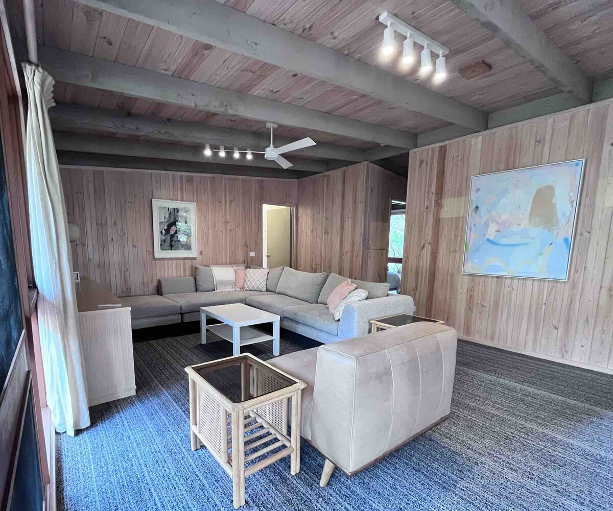 Trentham Cabin je nově zrekonstruovaná chata se 2 ložnicemi zasazená na rohovém bloku mezi zavedenými stromy naproti místnímu rezervnímu parku. Jedna ložnice se otevírá do soukromé paluby/ venkovní lázeňské lázně, druhý pokoj se otevírá do venkovní sprchy zábavné oblasti. Má dřevo-požár, který ohřívá celé místo v zimě, stejně jako AC jednotka/stropní ventilátory pro letní dny. Půdorys kuchyně/obývacího pokoje se otevírá na obrovskou terasu dvojitými dveřmi. Nachází se 15 minut chůze od přední a zadní pláže.