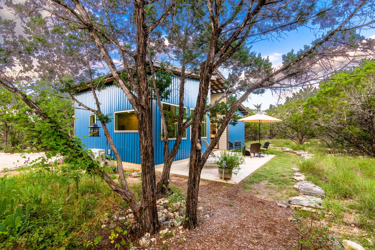Naše moderní chata se nachází na 40 krásných akrech nedotčené kopcovité krajiny. Pojme až 8 osob; ideální pro malé rodiny, páry nebo přátele, kteří chtějí relaxovat a užít si venkovský luxus. Hosté mají přístup k rybaření, koupání, opékání s'mores u ohniště, lenošení v altánu a objevování nemovitosti. Nachází se hned vedle pivovaru Real Ale, jen 2 míle od centra Blanco s restauracemi, nákupy a státním parkem Blanco. Austin a San Antonio jsou také snadno dostupné autem.