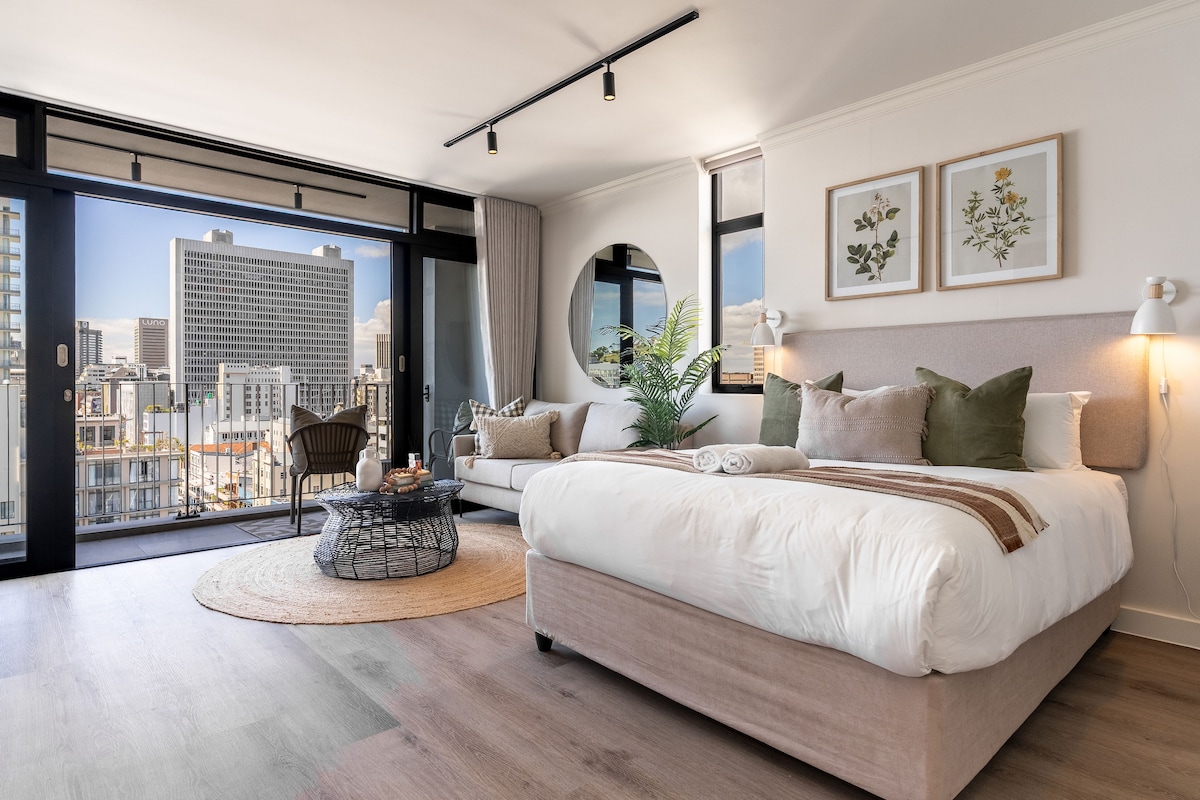 Plně zrekonstruovaný, stylový apartmán v trendy De Waterkant, ideální pro jednoho nebo dva hosty. Nabízí světlou ložnici, elegantní koupelnu z přírodního kamene a moderní kuchyň s otevřeným prostorem a obývací pokoj. Užij si neomezenou WiFi, 50" Smart TV s Netflixem a Prime Video, přístup do posilovny, zabezpečené parkování a 24hodinovou recepci. Projděte se do V&A Waterfront, CTICC, Cape Quarter a Green Point. Snadná doprava s Uberem, autobusy a autopůjčovnami v okolí.