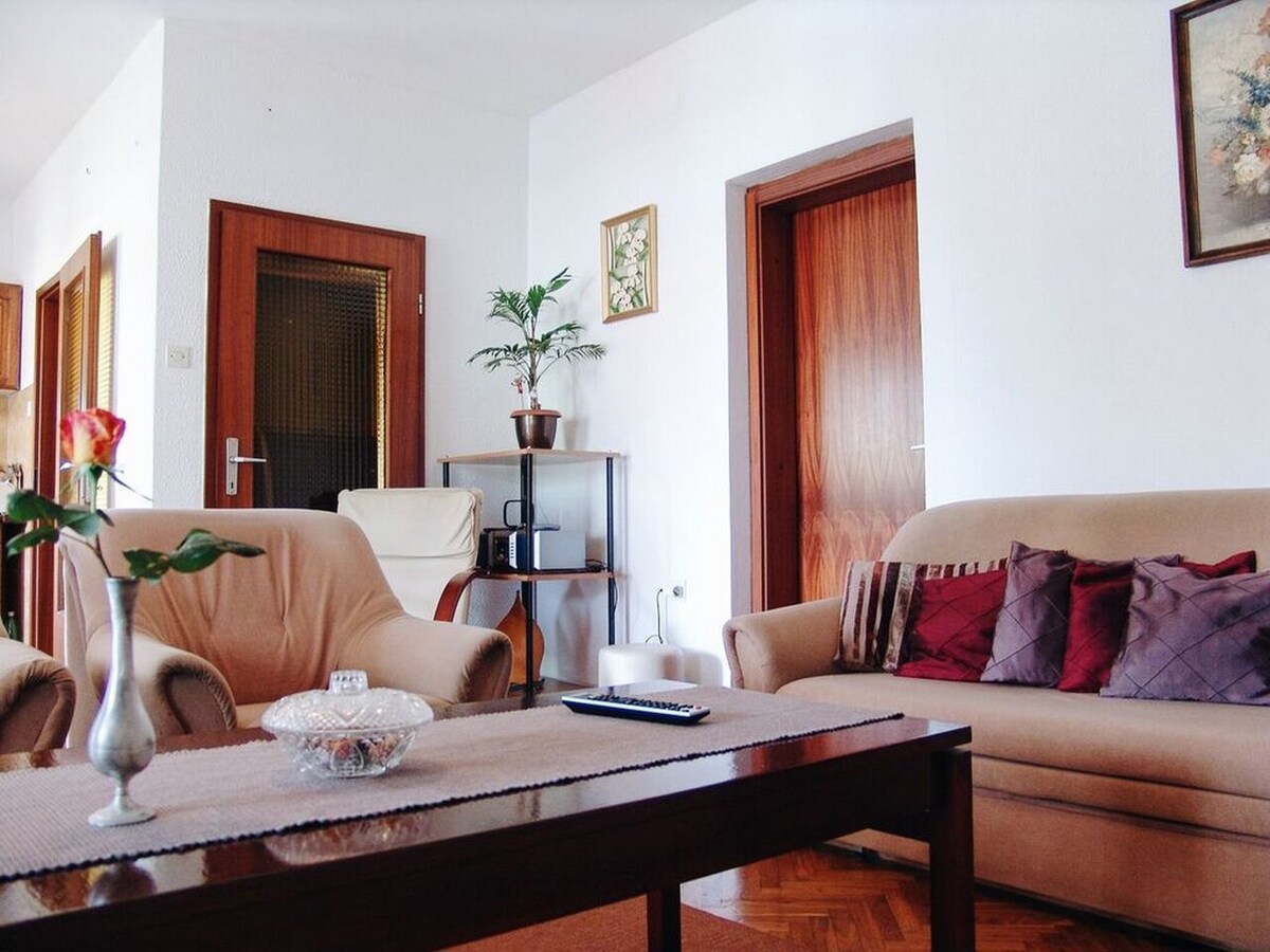 Byt se nachází v přízemí domu, obklopen zelení a má chladnou terasu. Na pláž 150 m, do centra a obchodů asi 300m. Parkování ve dvoře. Apartmán má dva pokoje, větší s manželskou postelí a menší se dvěma samostatnými lůžky. Kuchyně je vybavena - lednice, kadeřnictví, mikrovlnná trouba, rychlovarná konvice, plynový sporák, nádobí a příbory. Koupelna se sprchovým koutem a toaletou. Klimatizace. Domácí mazlíčci jsou vítáni (5 €/den). Pobytová taxa za osobu 1,5 €/den. Můj telefon: +385915492611