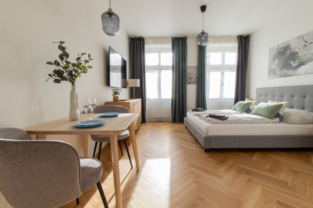 Nově zrekonstruovaný prostorný apartmán kombinuje prvky moderního půvabu a secesního interiérového designu z 19. století. Včetně dřevěných parket z 19. století a mramorové koupelny s podlahovým vytápěním. Nachází se v centru Prahy 1 pár kroků od Václavského náměstí, Národního muzea a hlavního (železničního) nádraží.