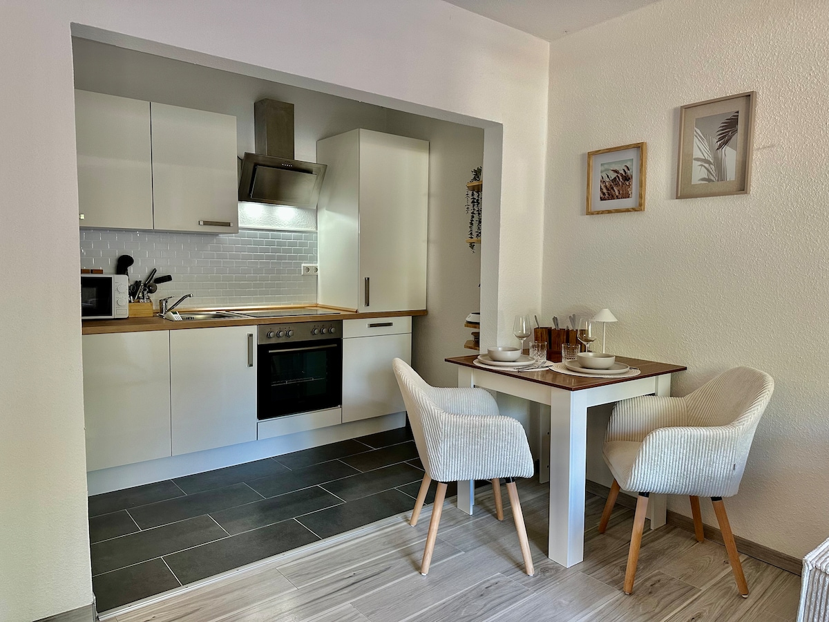 Byt se nachází v centru Wilhelmshavenu, takže jsou památky, restaurace a hlavní nádraží s přilehlou nákupní pasáží v docházkové vzdálenosti. Zařízení je stylové a moderní a díky otevřenému obytnému a kuchyňskému prostoru zajišťuje výjimečný pobyt. Nachází se ve 2. patře, takže je krásně světlý. V domě není žádný výtah, ale soukromé parkovací místo přímo před domem.