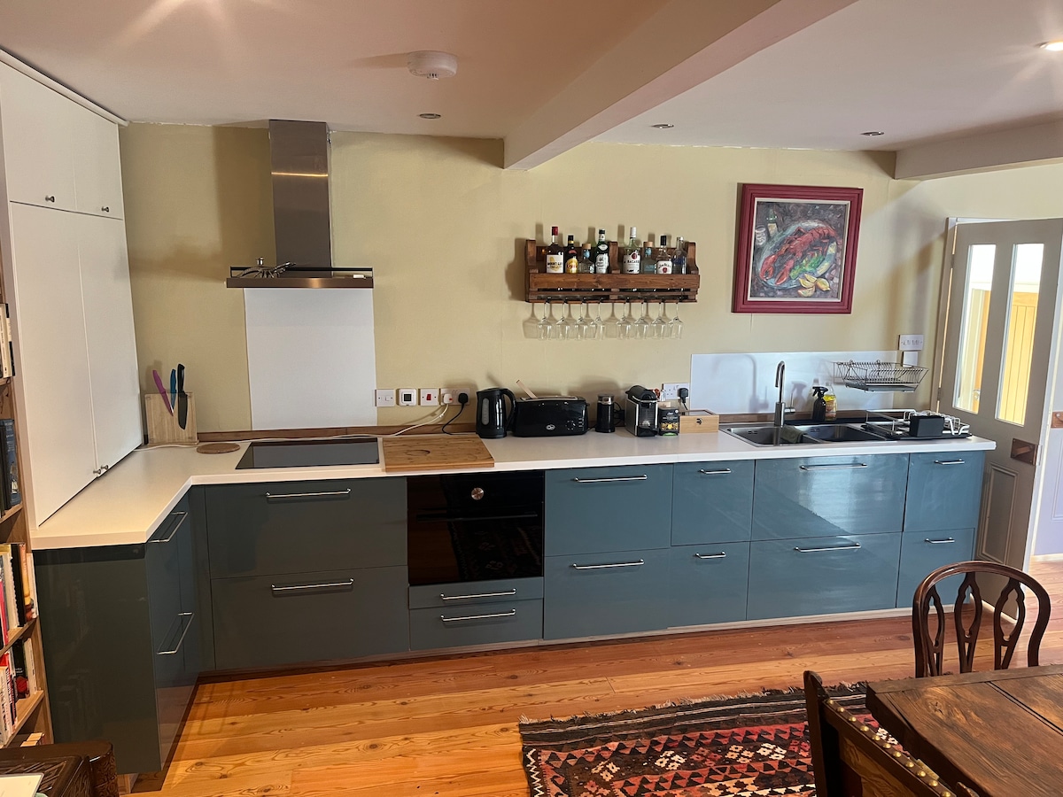 Naše chata nabízí útulný nezávislý pobyt s plně vybavenou kuchyní, obývacím pokojem, ložnicí s postelí velikosti super-king, luxusní sprchou v koupelně a užitkovým prostorem s další toaletou. Tento ekologický dům má podlahové vytápění ze vzduchu a obsahuje mnoho recyklovaných předmětů od vnějších recyklovaných lešenářských desek až po mnoho znovu využitých klenotů, které se nacházejí uvnitř. Venku je soukromá terasa orientovaná na jih a zahrada s vlastním parkovacím místem, vše jen klidnou procházku od města.