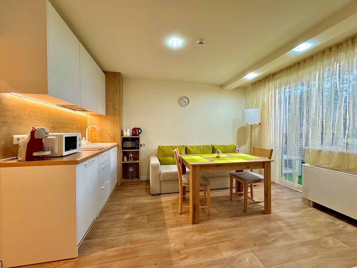 Spacious studio with fully equipped kitchen, a double comfortable bed and large sofa bed, wardrobe, commode and dinning table, comfortable chairs, TV and all you need for rest or home office in the mountain. The studio has its own large bathroom, as well as a seating area, and a terrace. Apt. B53 is located in the Borovets Gardens complex, a 7-minute walk from the gondola station. The building has a security and free guests parking.