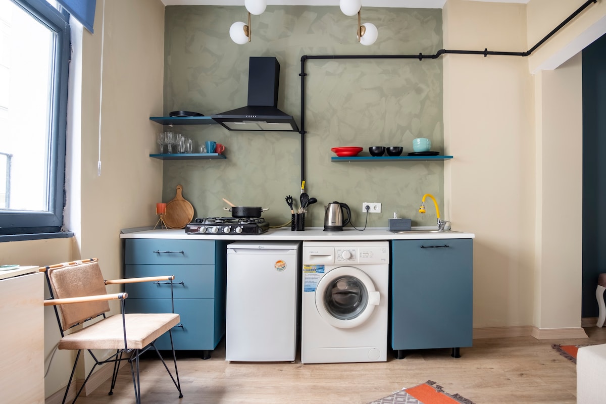 Tohle je náš domov. Milujeme ho. Záleží nám na něm, záleží nám také na pocitu prostoru a kvalitě času. Doufáme, že i vy. Tato 160m2 (1700sqft) s vysokými stropy, 1 ložnice se nachází ve 4. patře historické polobytové budovy. I když si rádi myslíme, že je to místo plné klidu, pohodlí a osobnosti, skutečné kouzlo spočívá právě v tom, kde se nachází. Je sotva minutu od trajektů a nějakým způsobem se nachází v klidu uprostřed shonu Kadikoy