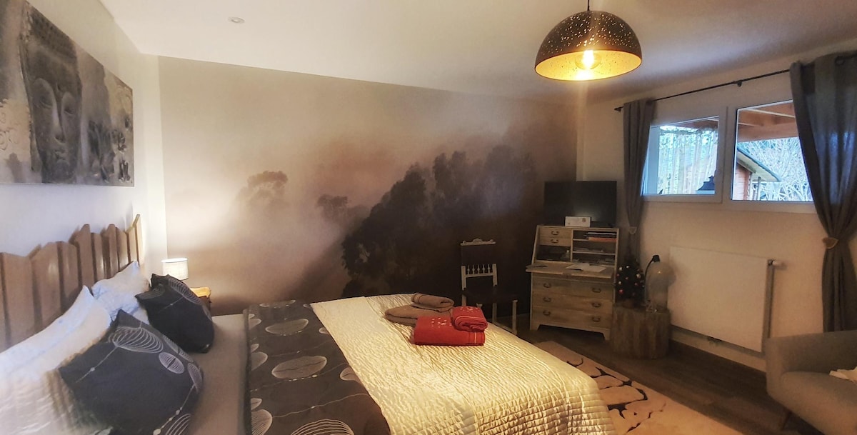 Dobrý den! Vítejte! Snídaně v ceně, pokoj pro hosty o rozloze 25 m2 (přiléhající k našemu domu) ve Vaux-et-Chantegrue, samostatný vchod, klidné prostředí, s terasou s výhledem na Mont d'Or, 10 minut od lyžařského střediska Métabief, 15 minut od Pontarlier, 20 minut od Švýcarska. Tento půvabný pokoj je vybaven pro 2 osoby. (Možnost přistýlky pro dítě). V restauraci Le Kota Grill nabízíme také menu a regionální speciality.