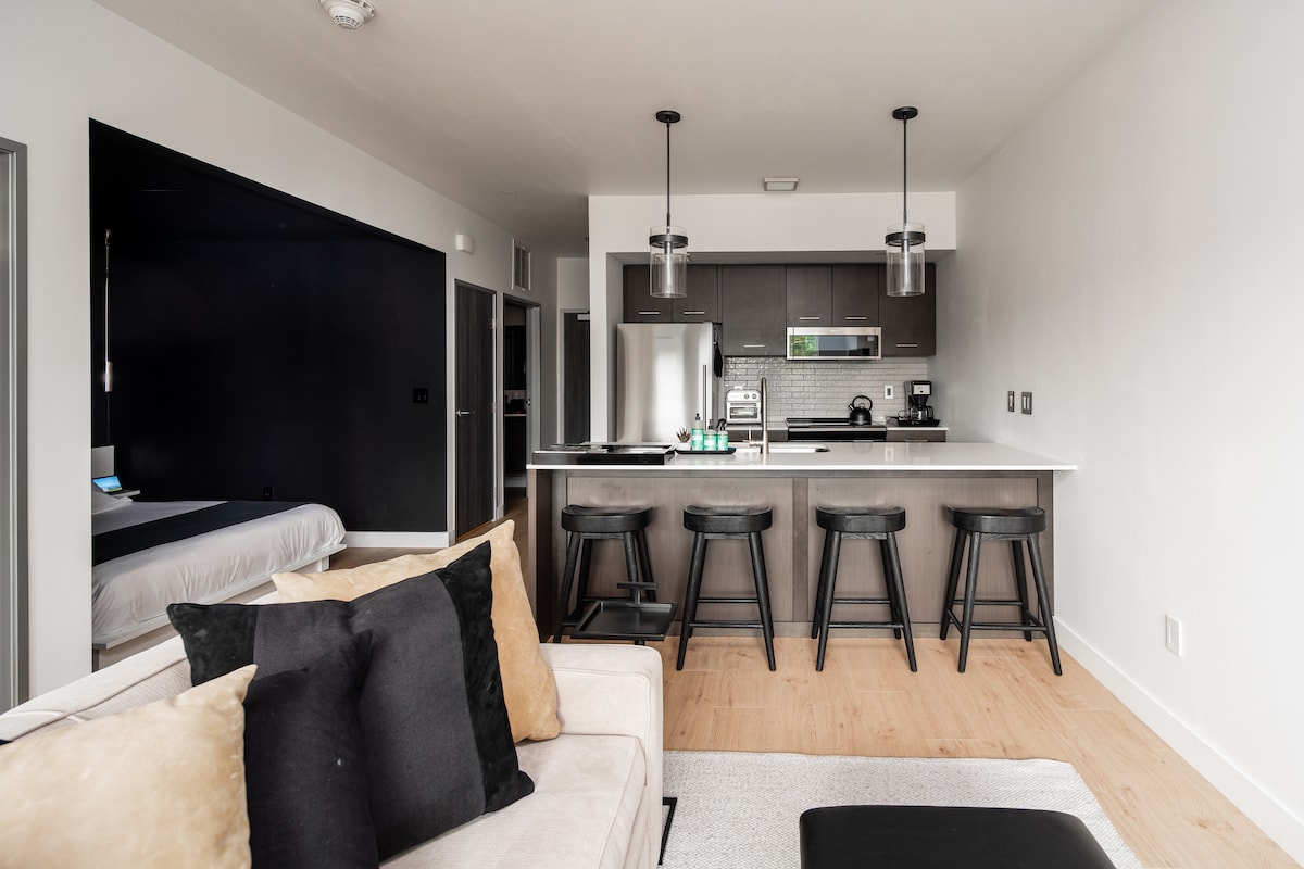 Tento apartmá se nachází v trendy a prostorné čtvrti Four Corners Warehouse District. K dispozici je velká manželská postel, nové ložní prádlo a ručníky, vstupní prostor s konferenčním stolkem, mikrovlnná trouba, minilednička/mraznička a kávovar Keurig. Samostatná koupelna má sprchový kout. Hned u jednotky je osvětlené parkoviště s jednoduchým přístupem z hlavního patra. Domácí mazlíčci povoleni, mimo jednotku musí být na vodítku. Několik restaurací v docházkové vzdálenosti.