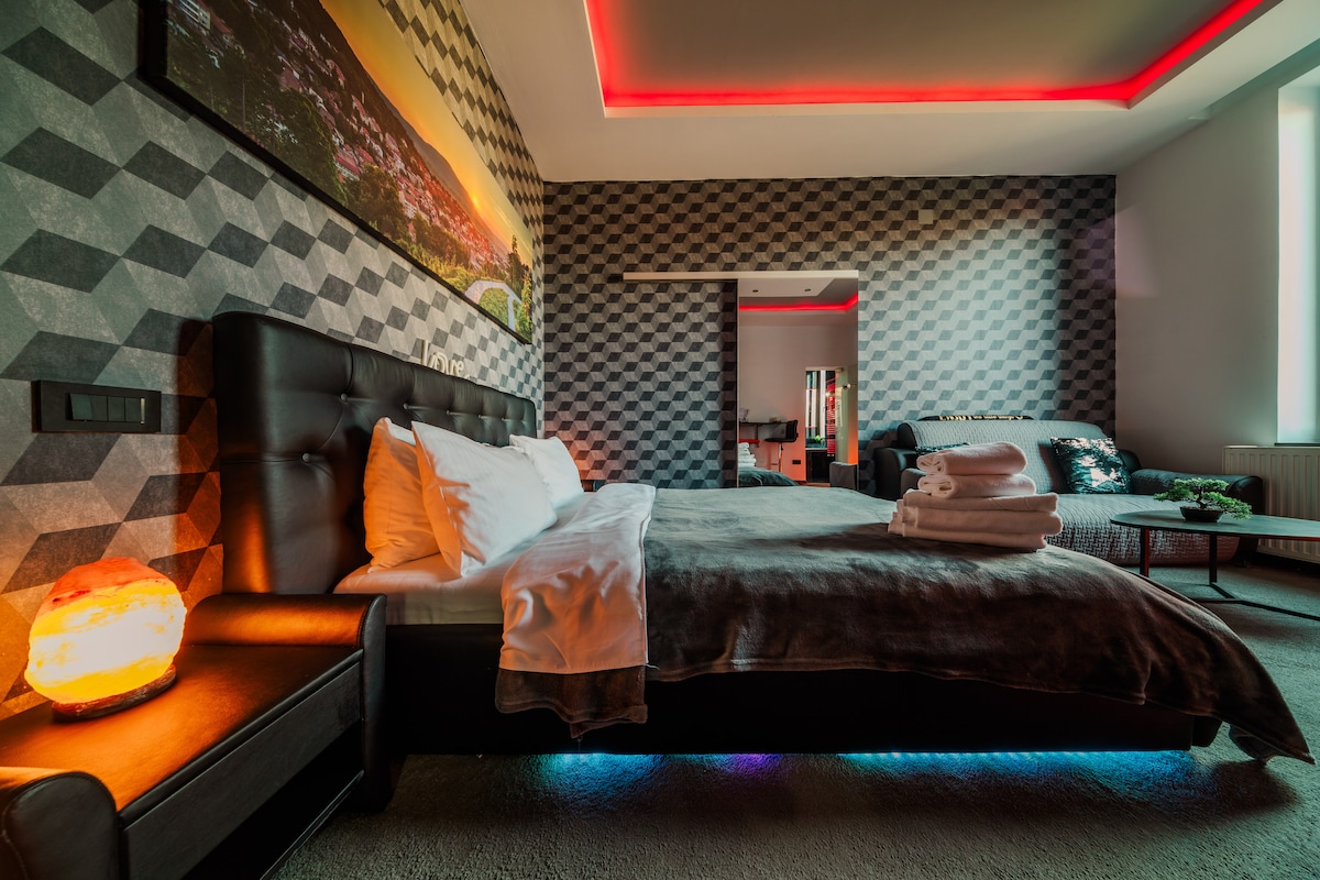ROOM „21“ je součástí exkluzivní kolekce tří apartmánů, které byly promyšleně vytvořeny tak, aby v sobě spojovaly moderní eleganci s teplou a příjemnou atmosférou. Užij si plyšové, husté koberce pod nohama a plně přizpůsobitelné LED osvětlení, to vše v nádherné zelené krajině na úpatí hory Tâmpa Určitě tě potěší, že pulzující srdce Brașova, náměstí Council Square, je jen pět minut chůze daleko, takže máš na dosah nejlepší restaurace, obchody a kulturní atrakce ve městě.