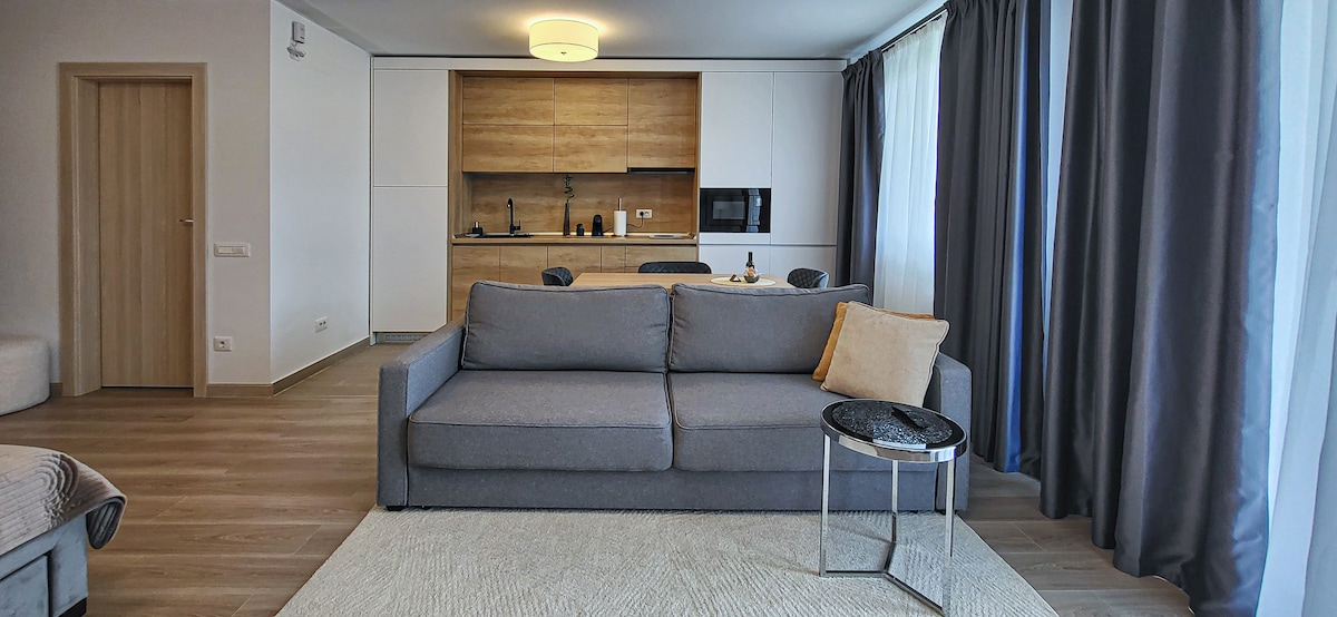 Ultramodern fully equipped apartment with private parking and smart lock for check in / check out. It is located in brand new residential area - Cartier Coresi, near the Coresi Shopping Resort, at 10 minutes from the historic center. It has a bedroom with queen size bed, living room with expandable sofa bed, fully equipped kitchen, air conditioning, large terrace with hammock, washing machine / dishwasher, two 4k TVs with Netflix and HBO Go.