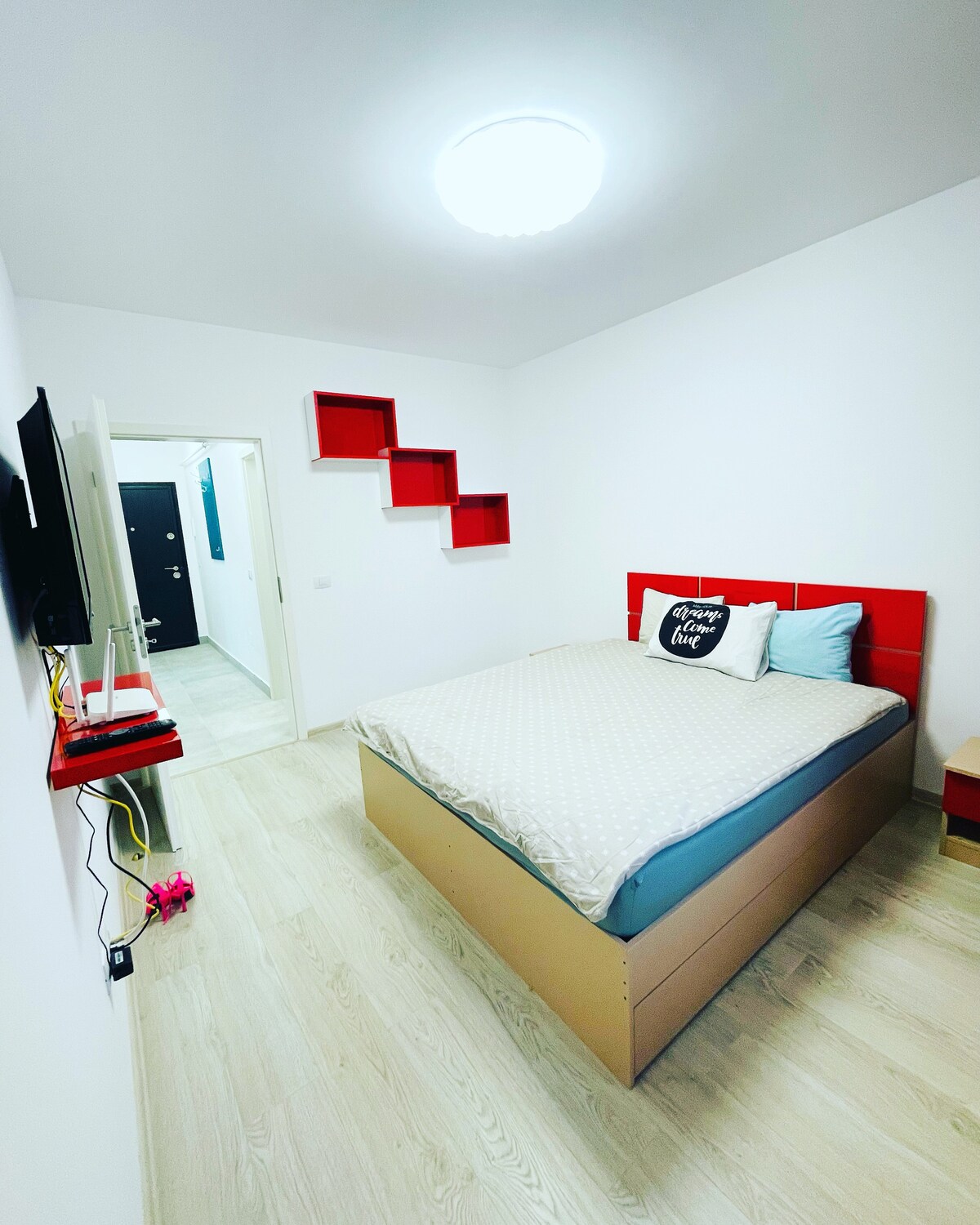Pentha Apartment is a 2 bedroom, 2 bathroom apartment located in a brand new building, part of one of the newest neighbourhoods in Brasov, moments away from the largest shopping center in Transylvania, Coressi Shopping Centre. The apartment has 2 large bedrooms, each with a queen and king-size bed, a living room with direct access to a large balcony, and a fully equipped kitchen. Surrounding the apartment building are a kids' play area, restaurants, a pharmacy, and local shops. Welcome!