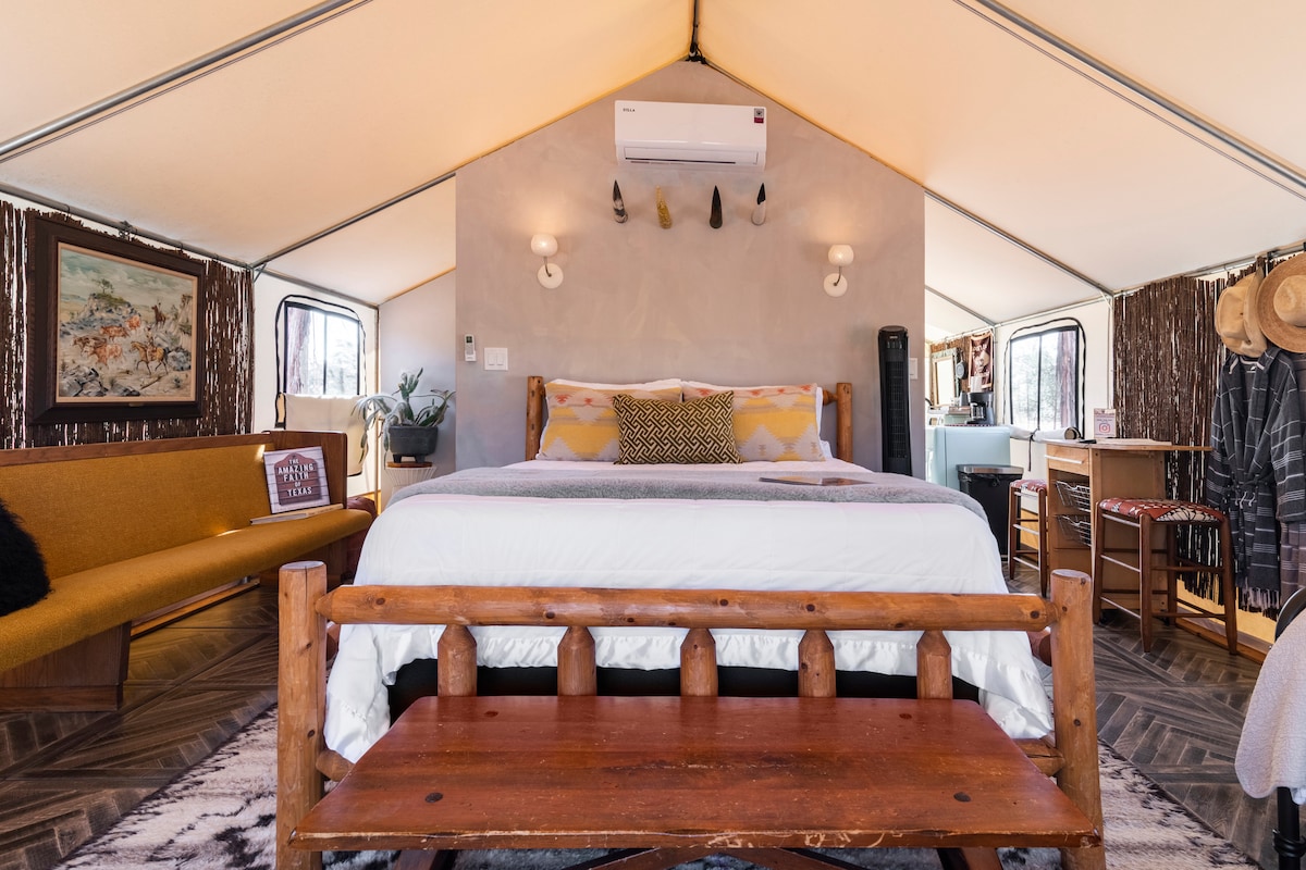 Glamping pod hvězdami + bazén * Přísné – ŽÁDNÍ domácí mazlíčci Tyto stany s plátěnými stěnami byly navrženy tak, aby vám během pobytu nabídly vše, co potřebujete. Každý stan je plně instalovaný, má vlastní koupelnu/sprchu, teplou vodu, kuchyňský kout, klimatizaci a topení plus kamna na dřevo. Jsou zde pouze dva stany se společným kovbojským ohništěm. Texaská noční obloha a spousta hvězd✨⛺️. Vytvořeno pro dobrodružství a propojení. Pokud si chceš pronajmout oba stany, pošli mi zprávu.