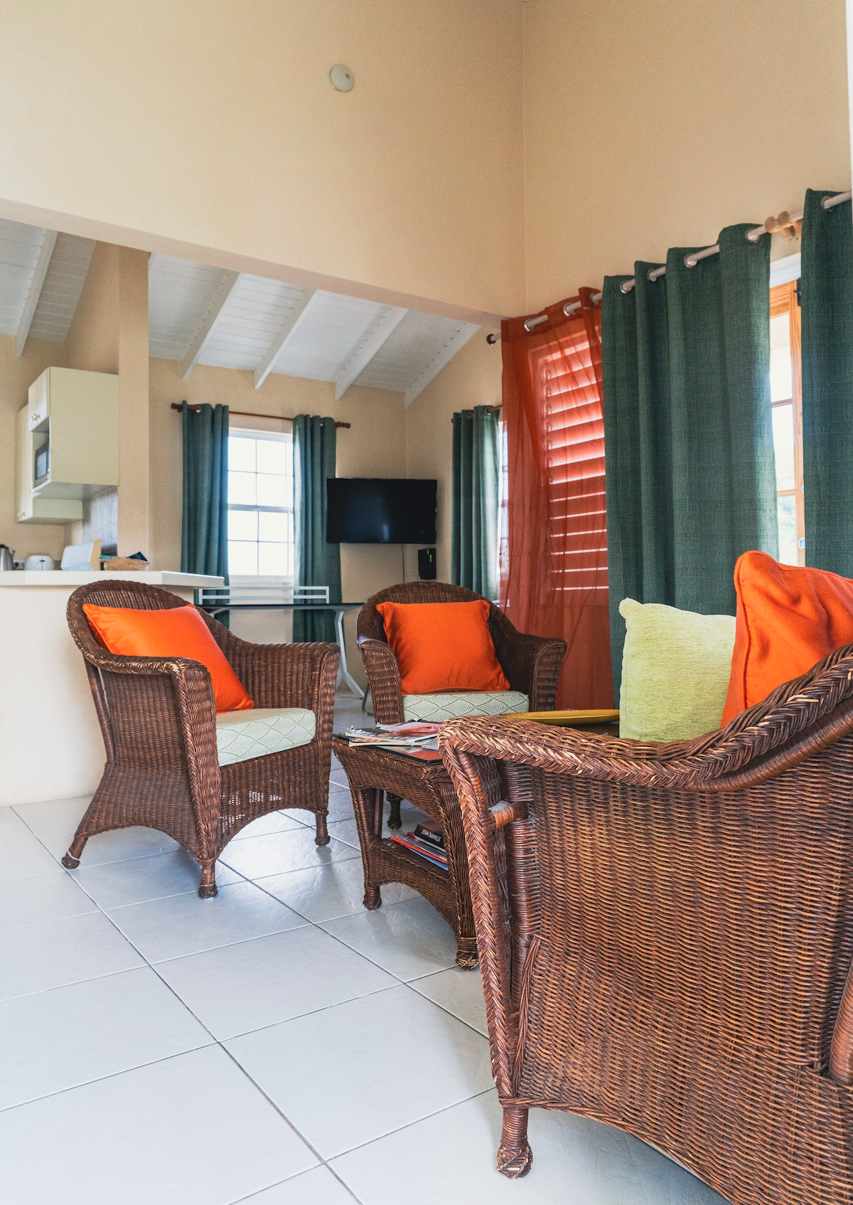 The unit is fully self-contained with a kitchen, living room, bedroom, bathroom & covered outdoor patio area. It is fully air-conditioned and has free WiFi & cable TV. The custom designed entertainment center and wardrobe neatly separates the kitchen/living room from the cozy bedroom and bathroom. The bedroom has a queen-size bed & lovely lamps adorned with gorgeous turtle carvings. The floral coverlet lends a tropical feel to this bedroom confirming that you are indeed in a tropical paradise!