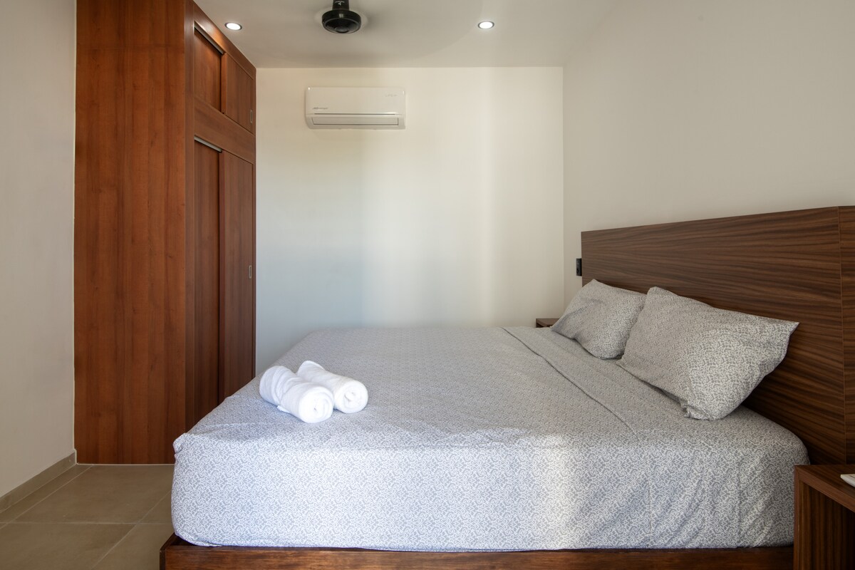 Depa amplio y luminoso en planta alta con 2 camas queen súper cómodas, A/C en la recámara y ventiladores en sala y cocina. Cuenta con cocina equipada, salita acogedora y balcón con vista a palmeras. Estás a solo 2 min de la playa y a 1 min de cafés, tiendas y restaurantes. Disfruta el patio compartido con hamacas, árboles frutales, asador y área de pesas artesanales. Ideal para relajarte, surfear o trabajar remoto con buena vibra.