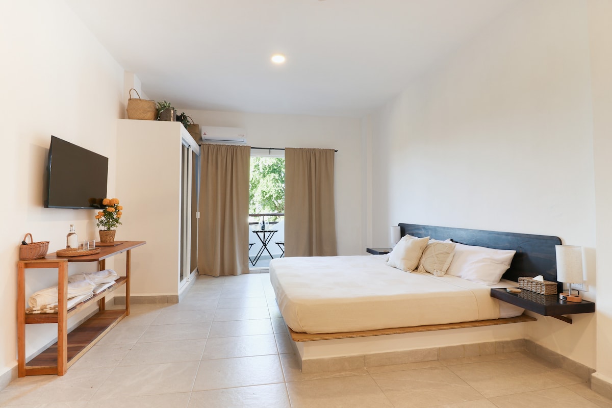 Spectacular and modern new Loft, ideal for two or three guests, you will enjoy a king bed, Smart TV, high-speed Wi-Fi connection, private bathroom and access to a private terrace, shared patio and pool as well as a roof top to watch the sunset Jen 3 bloky od pláže Zicatela a 3 bloky od La Punta, je to dost daleko od hluku k odpočinku, ale v blízkosti pěšky do komerční oblasti. Apartmá má zatemněné žaluzie, které maximalizují odpočinek a soukromí. Můžeš si rezervovat tuto velkolepou nemovitost