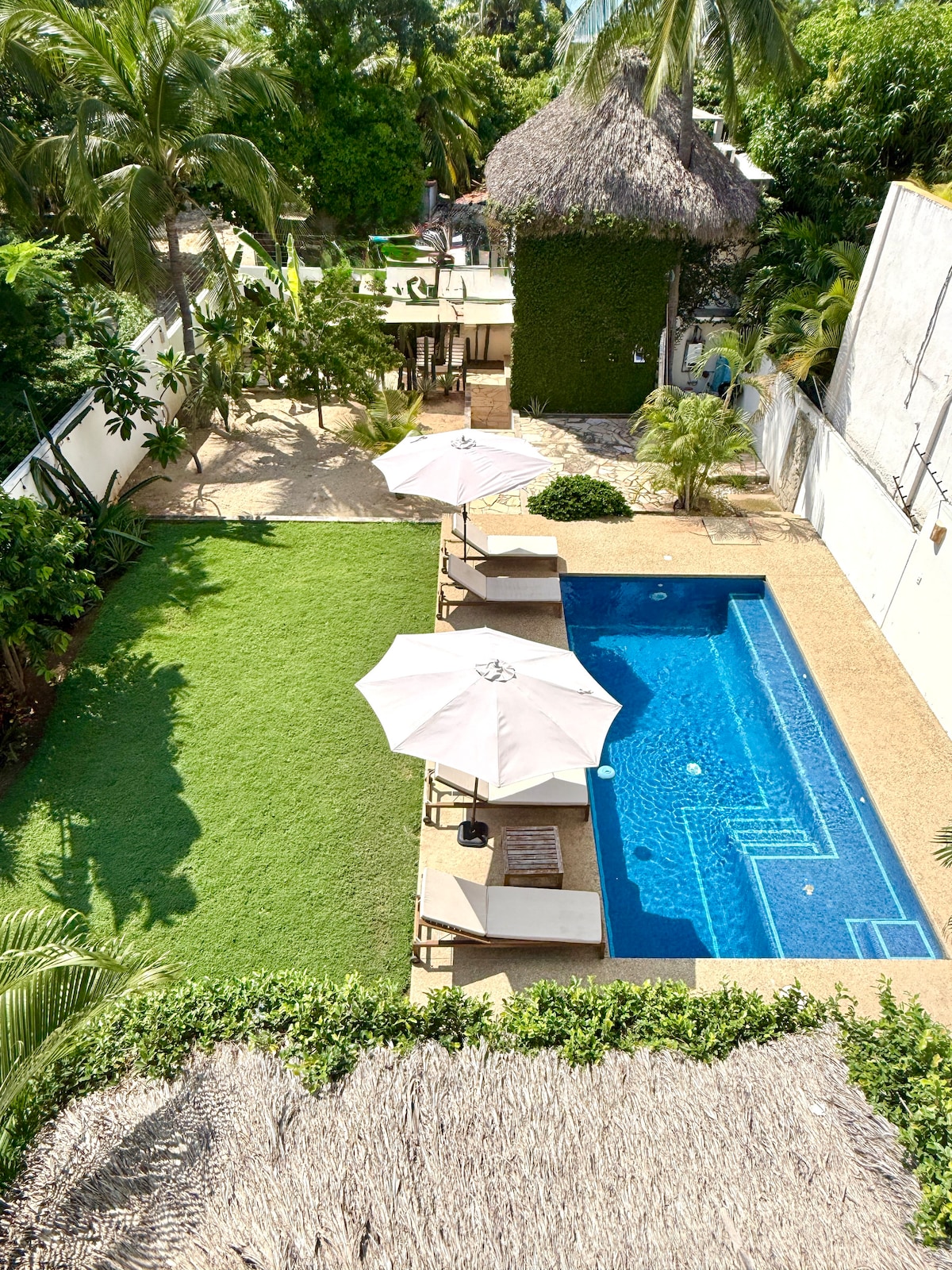Casa Dos Palmas je krásný dům postavený na míruku s bazénem jen pár minut chůze od pláže, obchodů a restaurací Playa Zicatela. Náš dvoupokojový apartmán se zahradou je vše, co potřebujete pro svou příští dovolenou v Puerto. Udělejte si ranní procházku po pláži, jděte surfovat nebo si dejte brunch v naší oblíbené místní kavárně „Cafe Dans“. Odpočiňte si na terase u bazénu a vychutnejte si zvuky oceánu.